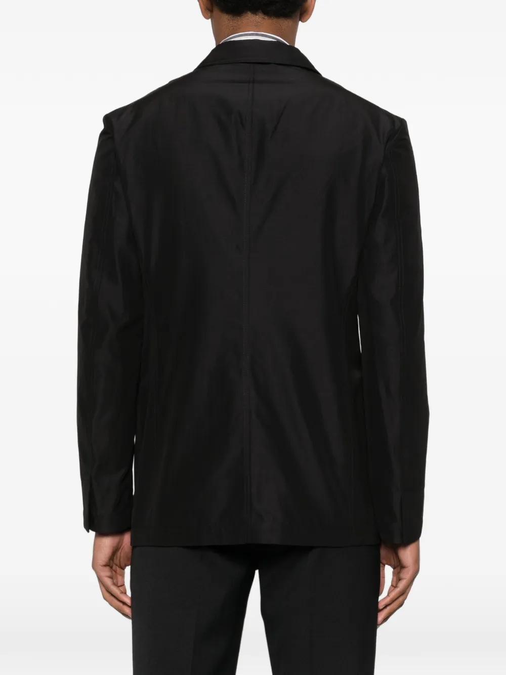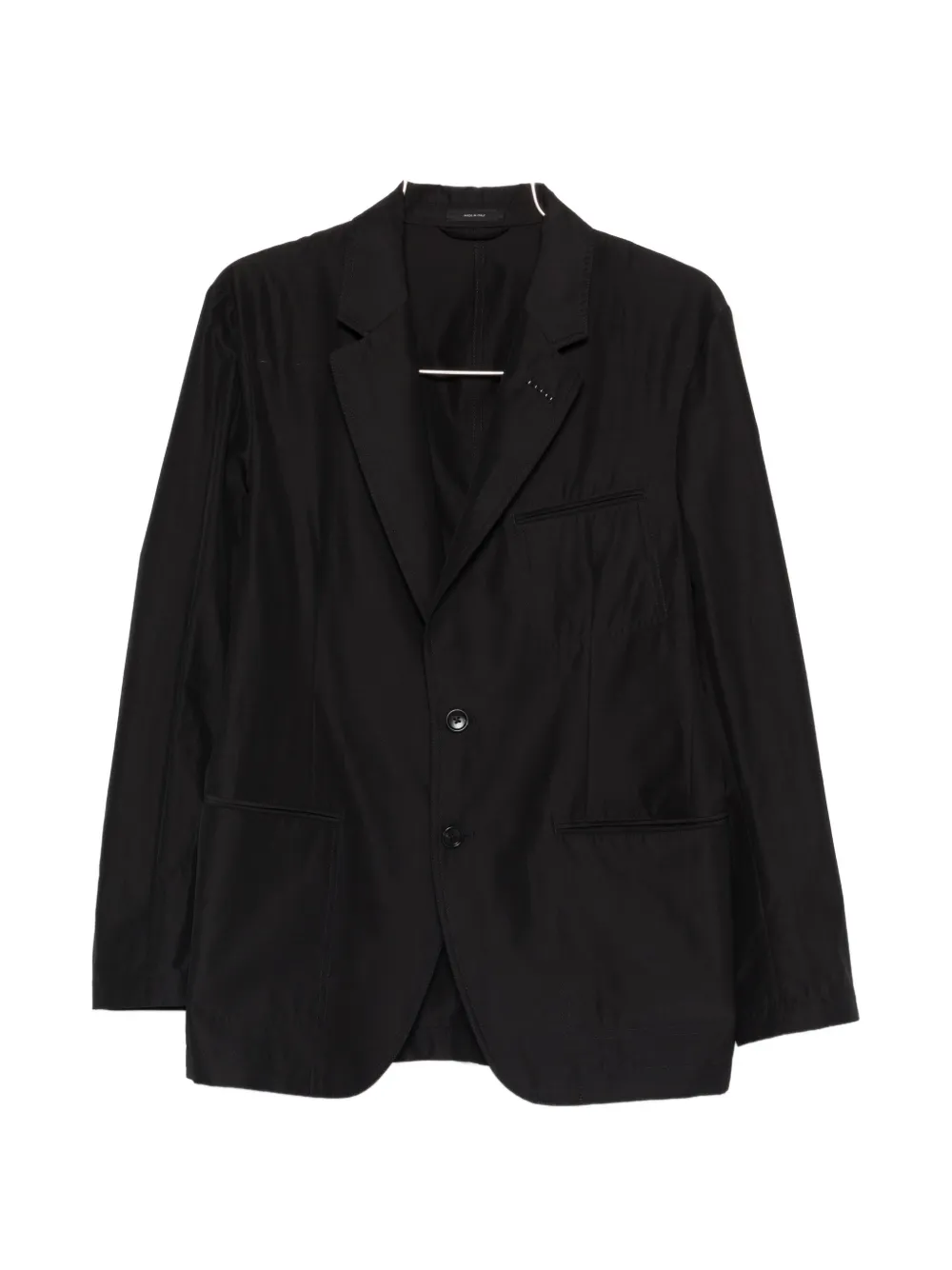 Черные лацканы с вырезом, нагрудный прорезной карман, застежка на пуговицы спереди, длинные рукава, передние прорезные карманы