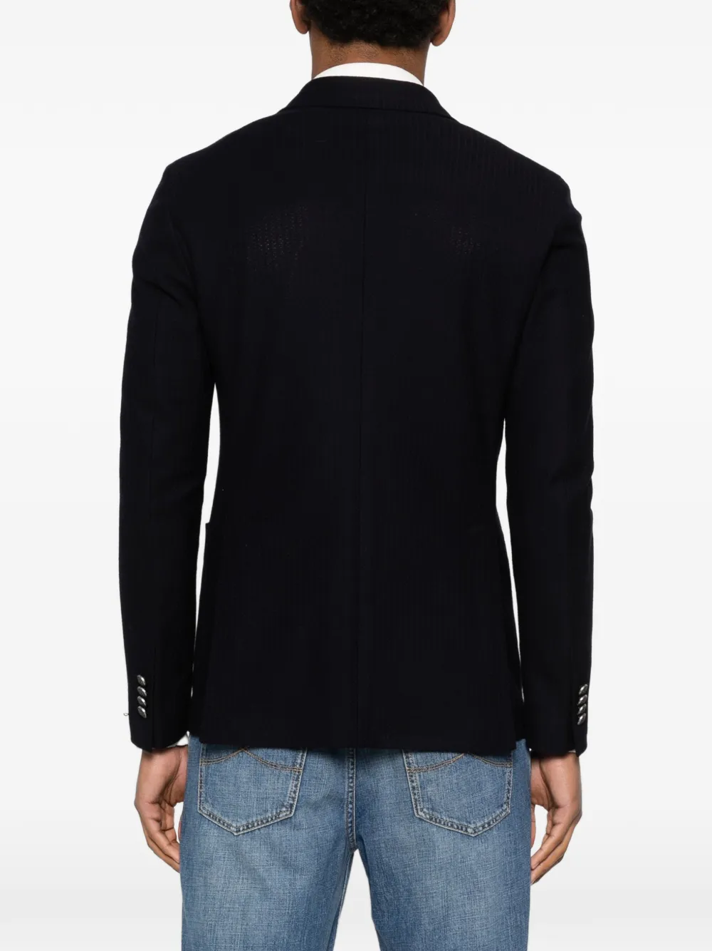 Синий двубортный пиджак на пуговицах, с лацканами с вырезом, накладными передними карманами и длинными рукавами