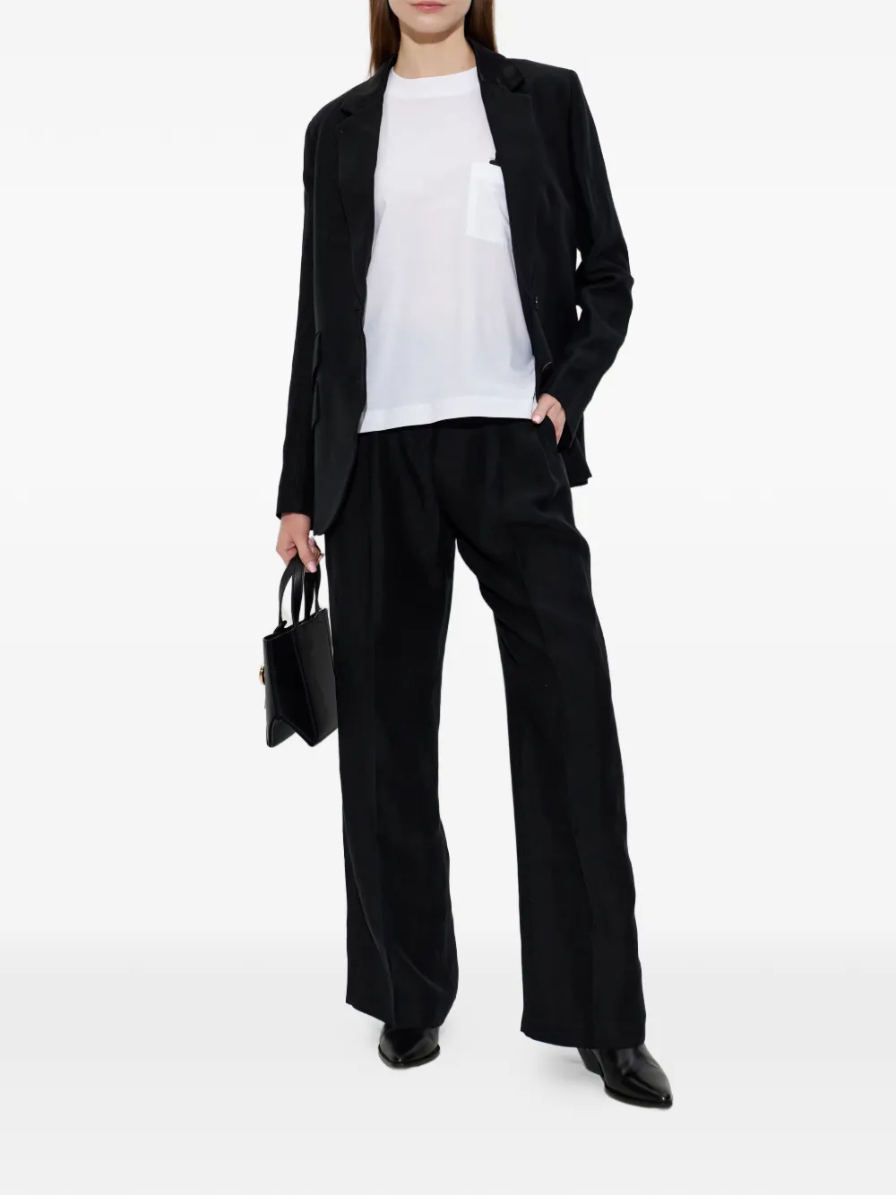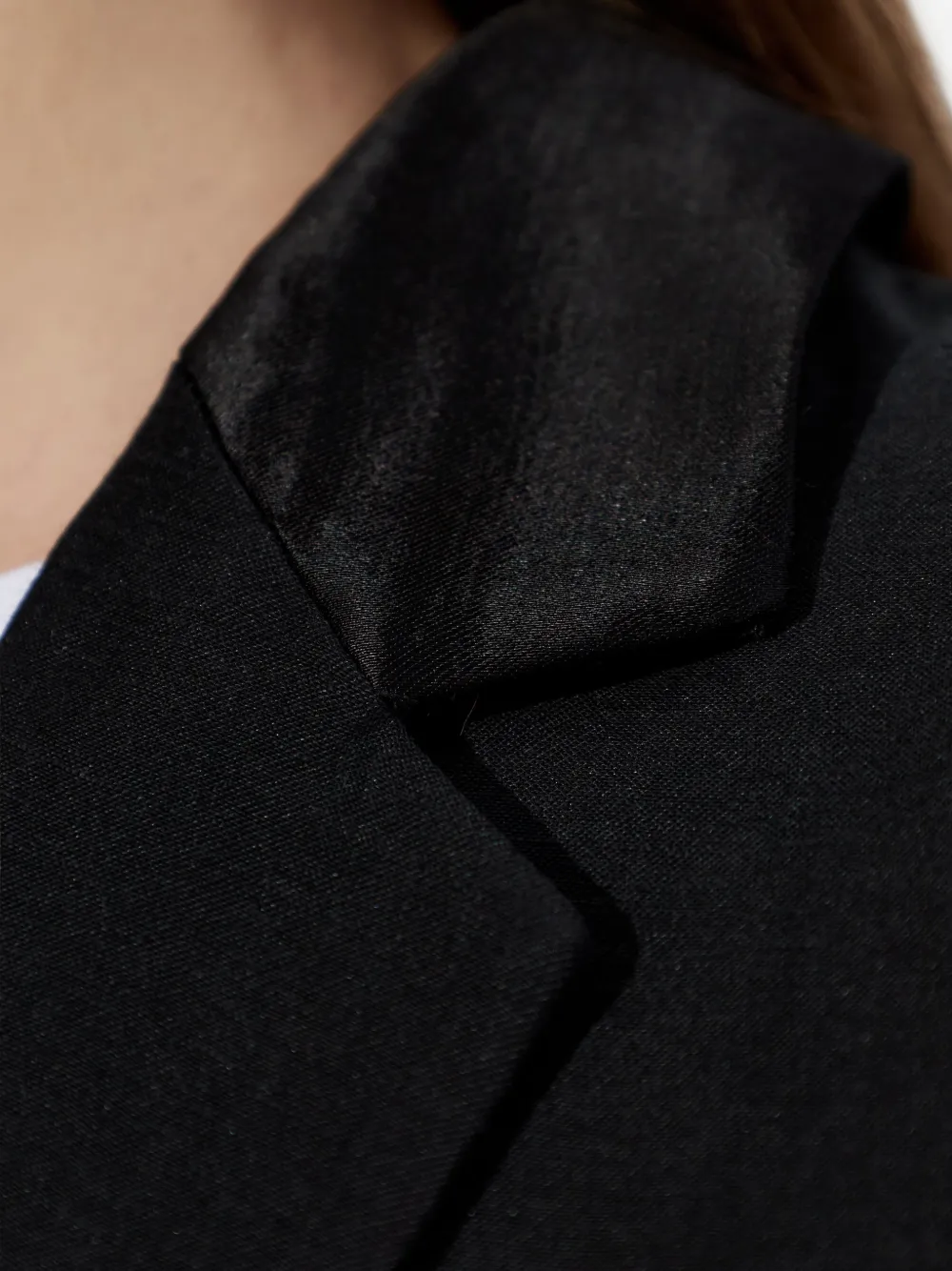 Черные лацканы с вырезом, застежка на пуговицы, клапанные карманы, длинные рукава, задний шлиц
