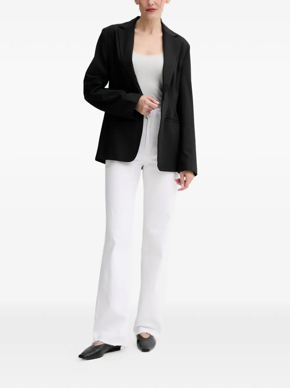 Черный пиджак с лацканами, двумя карманами, длинными рукавами, однобортной застежкой и подплечниками