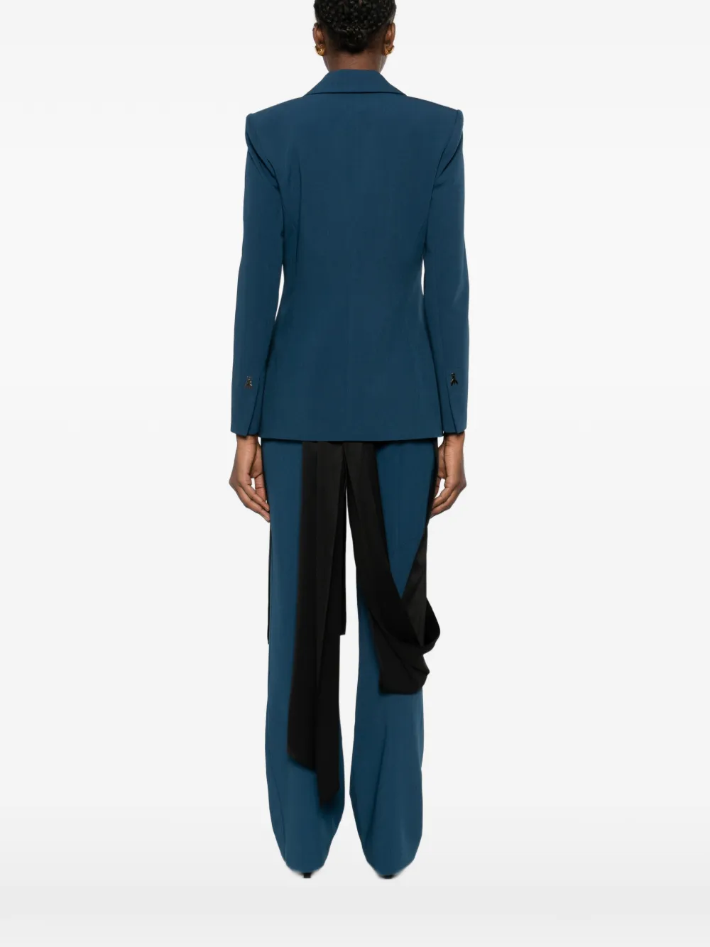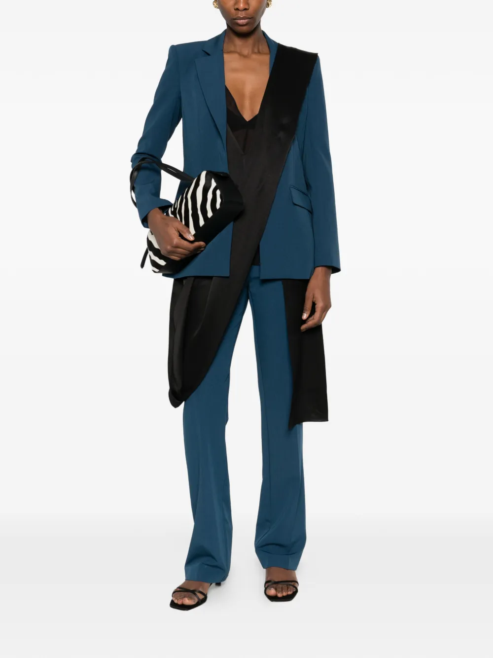 Лагуна-синий цвет, приталенный крой, накладные передние карманы, лацканы с острыми концами, длинные рукава, застегивается на одну пуговицу