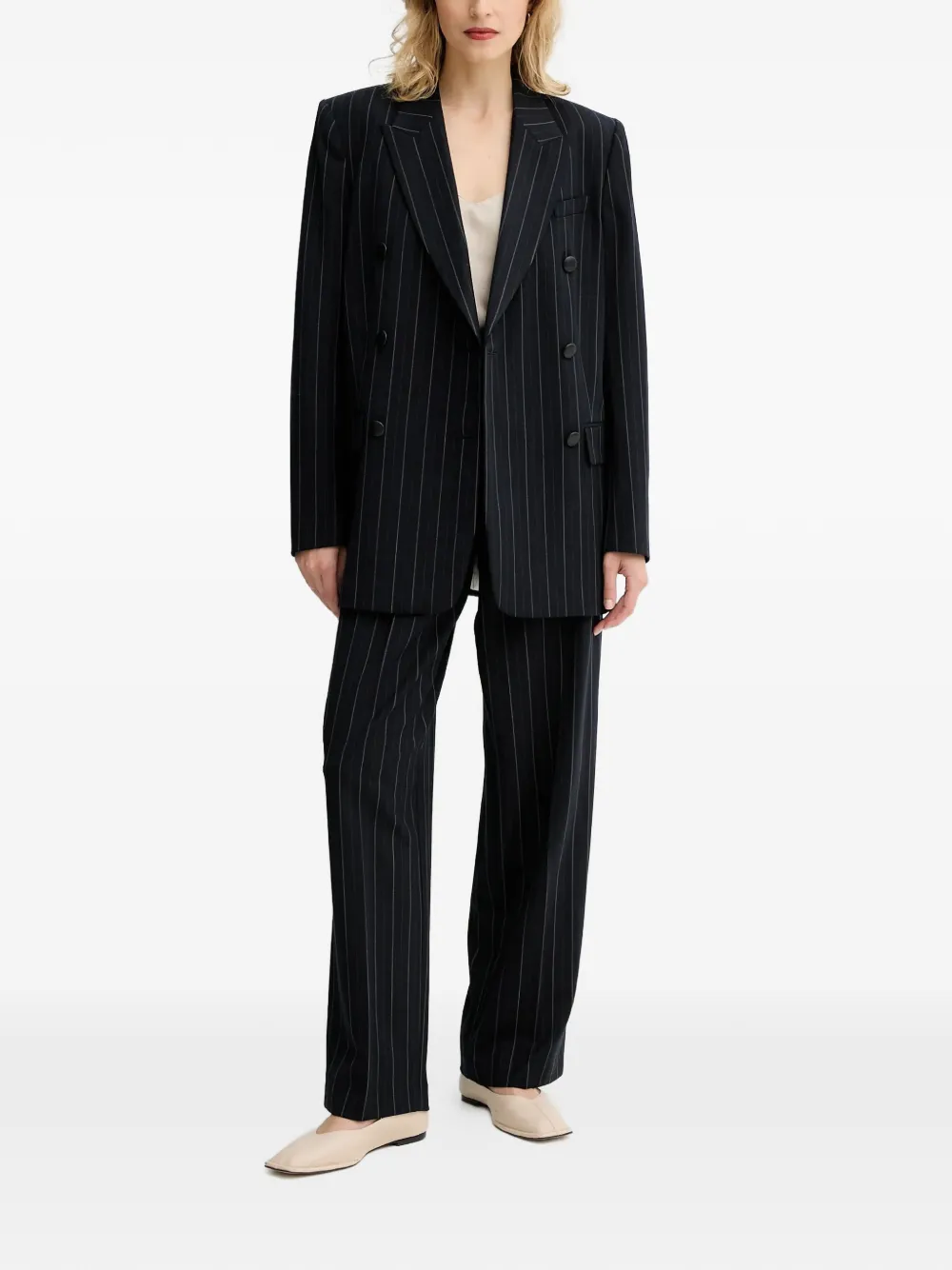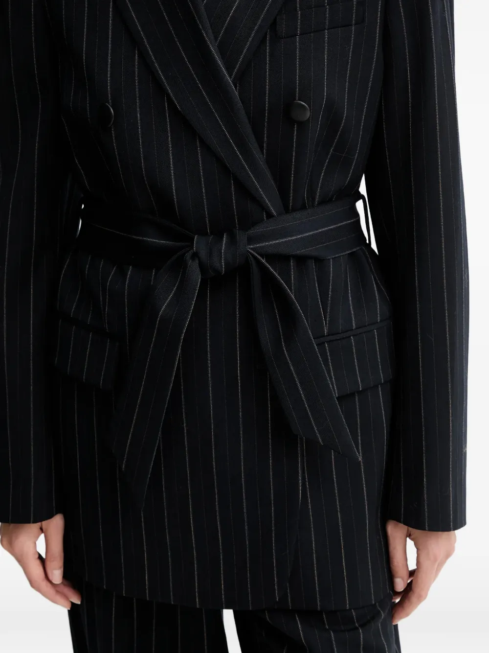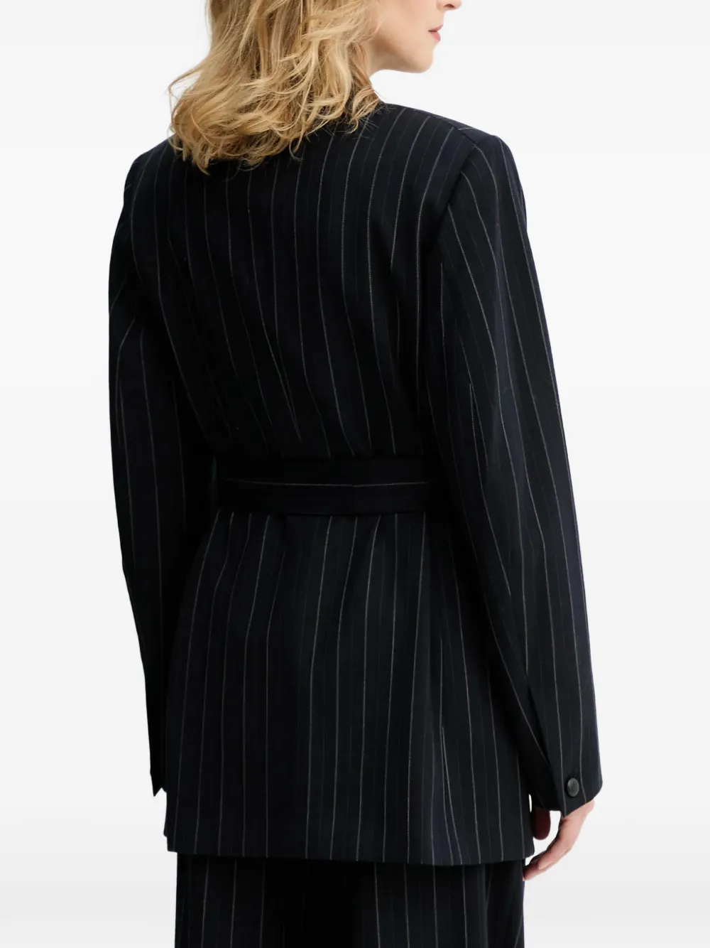 Темно-синий пиджак в полоску, двубортный, с широкими лацканами, поясом и накладными карманами с клапанами