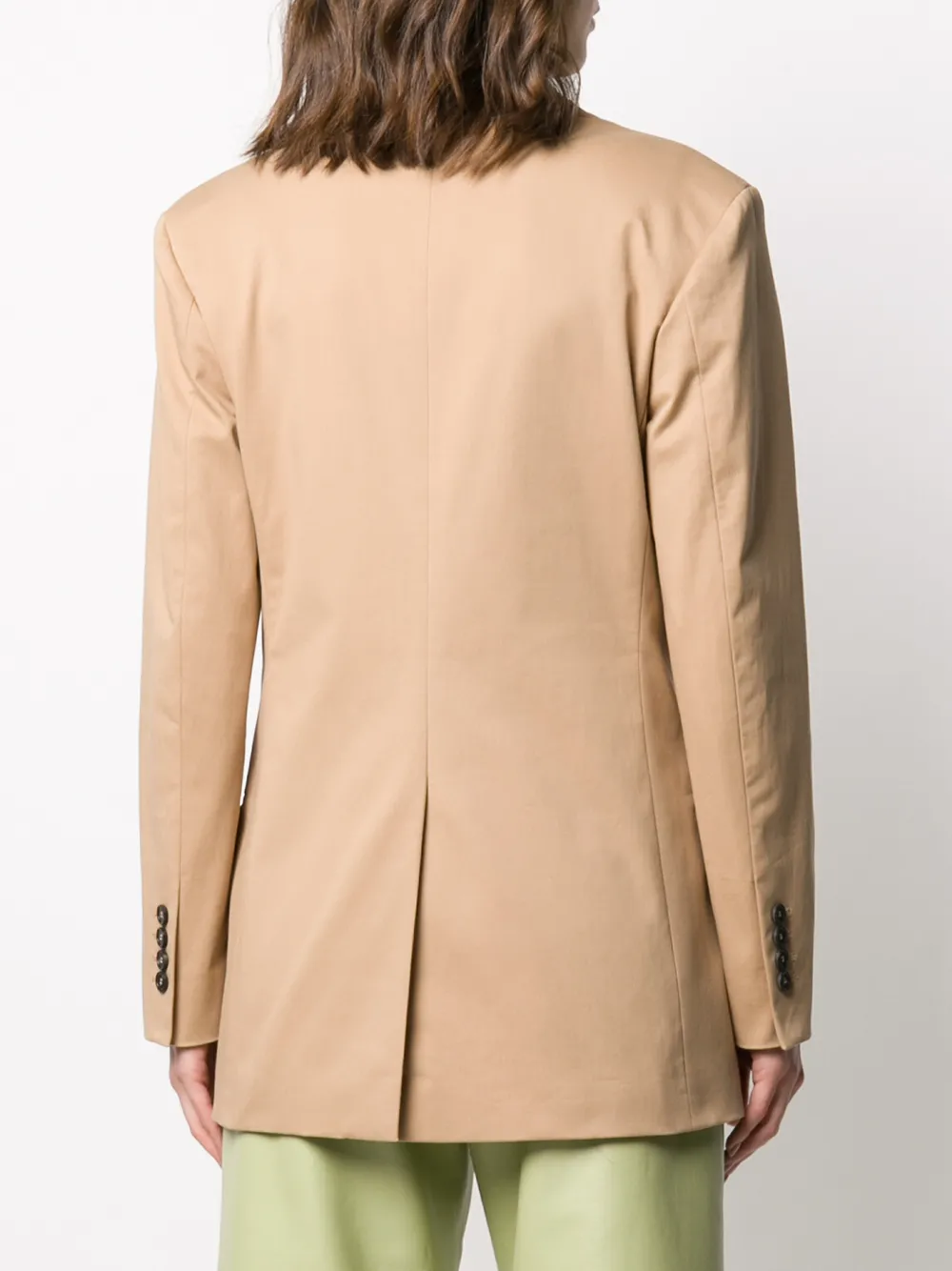 Двубортный блейзер от MSGM. Заостренные лацканы, застежка на пуговицах спереди, нагрудный карман, передние карманы с клапанами, длинные рукава, манжеты на пуговицах, шлица сзади и свободный крой.