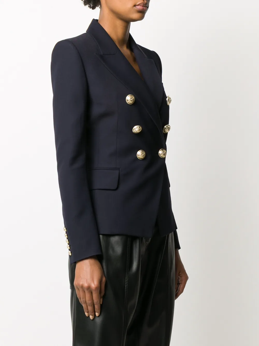 Приталенный двубортный блейзер от Balmain (Бальман). Двубортный фасон, заостренные лацканы, модель по фигуре, передние карманы с клапанами, прямой подол, нагрудный карман, манжеты на пуговицах и цельная подкладка.