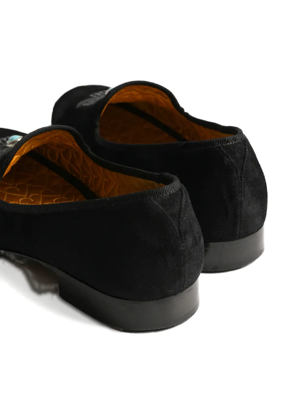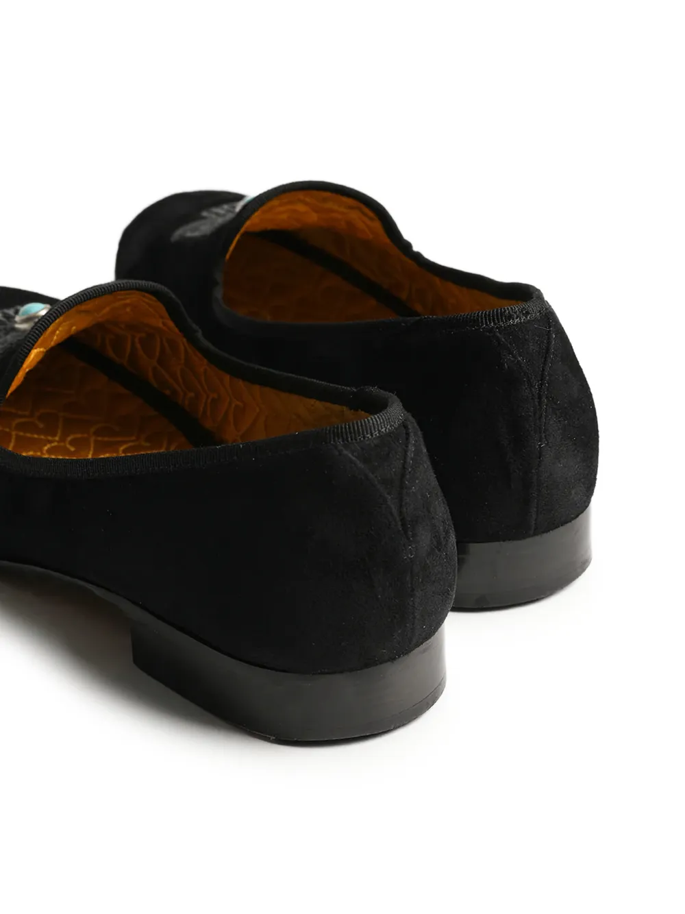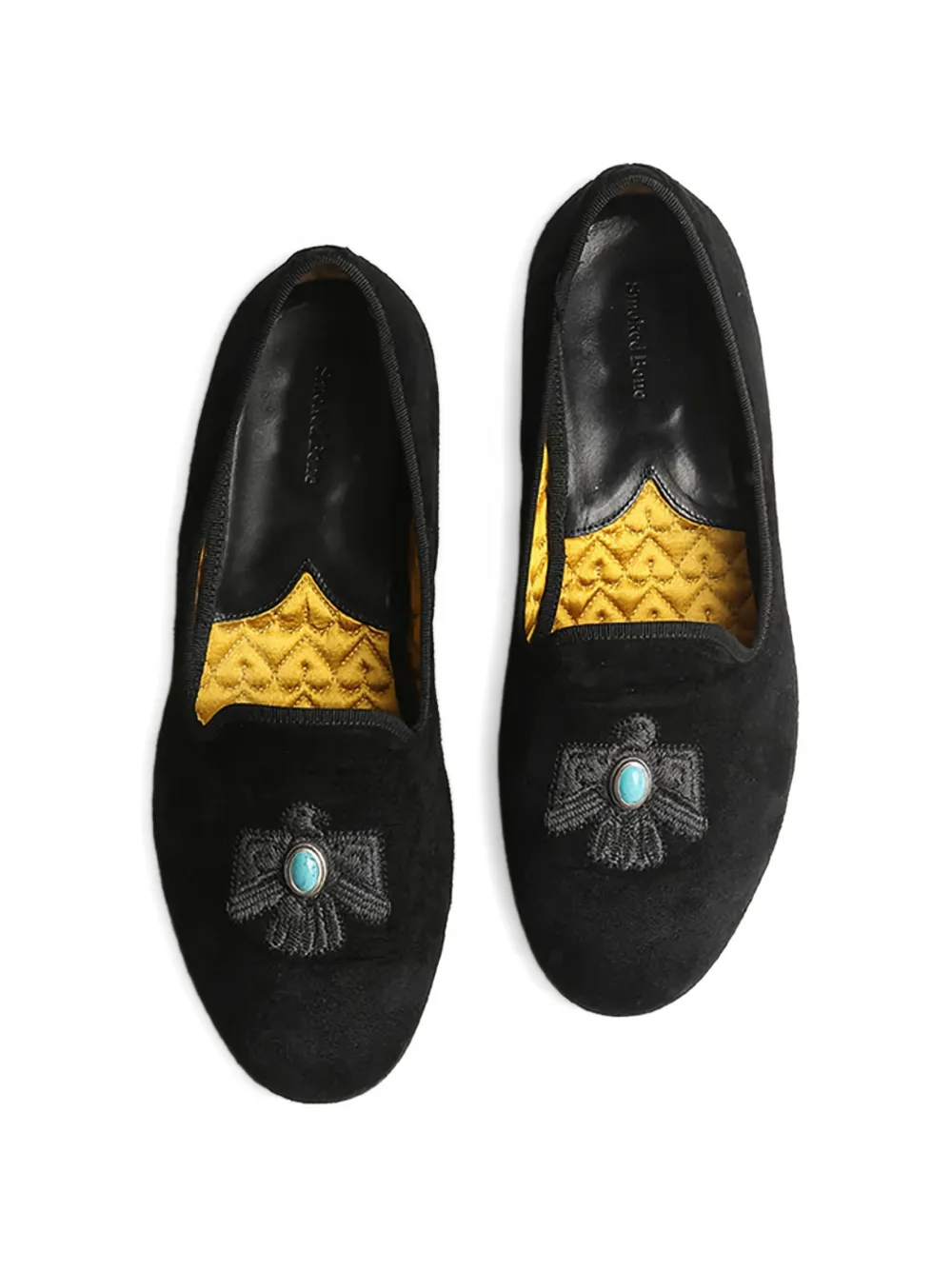 Черная замша с бирюзовыми заклепками, вышивкой в виде птицы-громовержца и кожаной подошвой