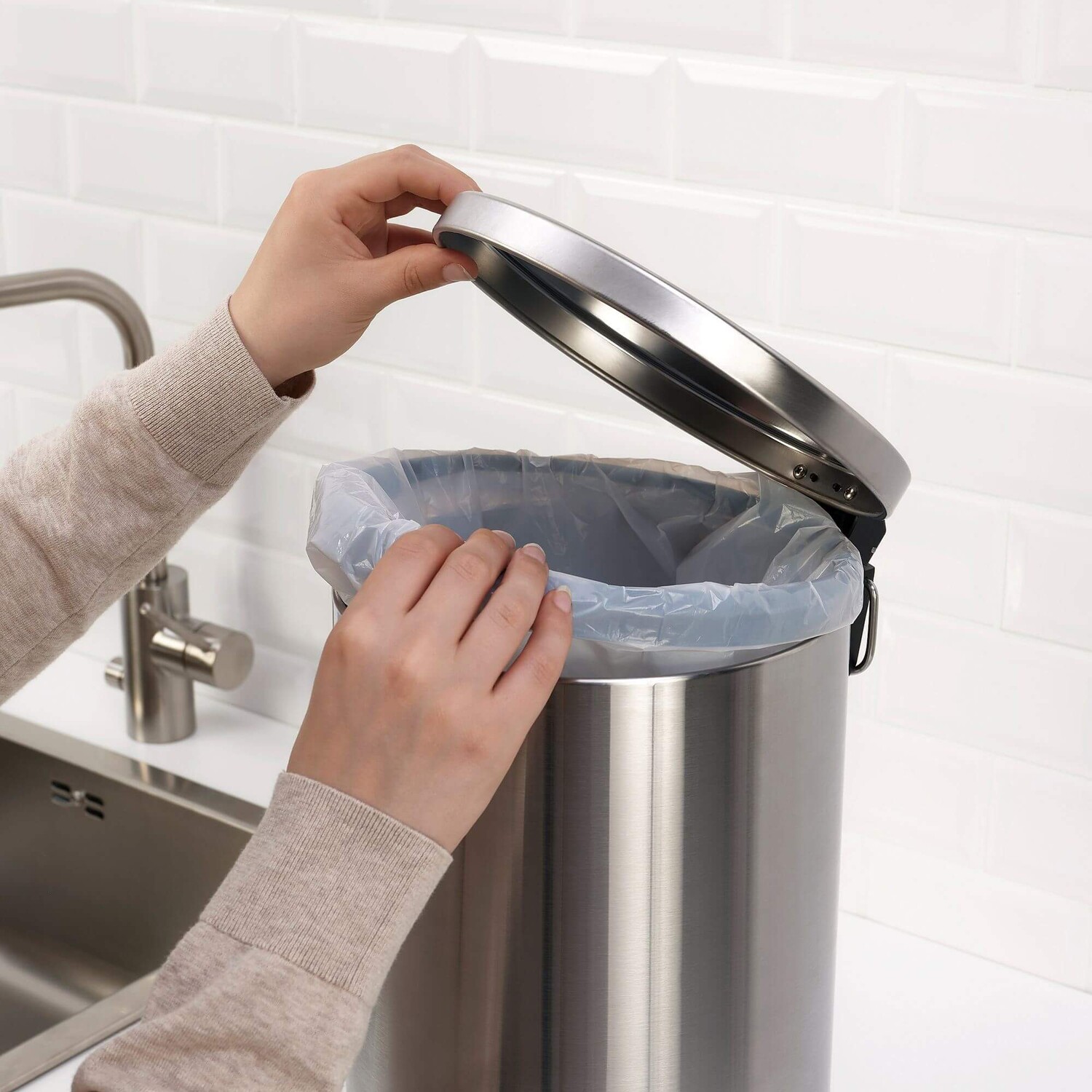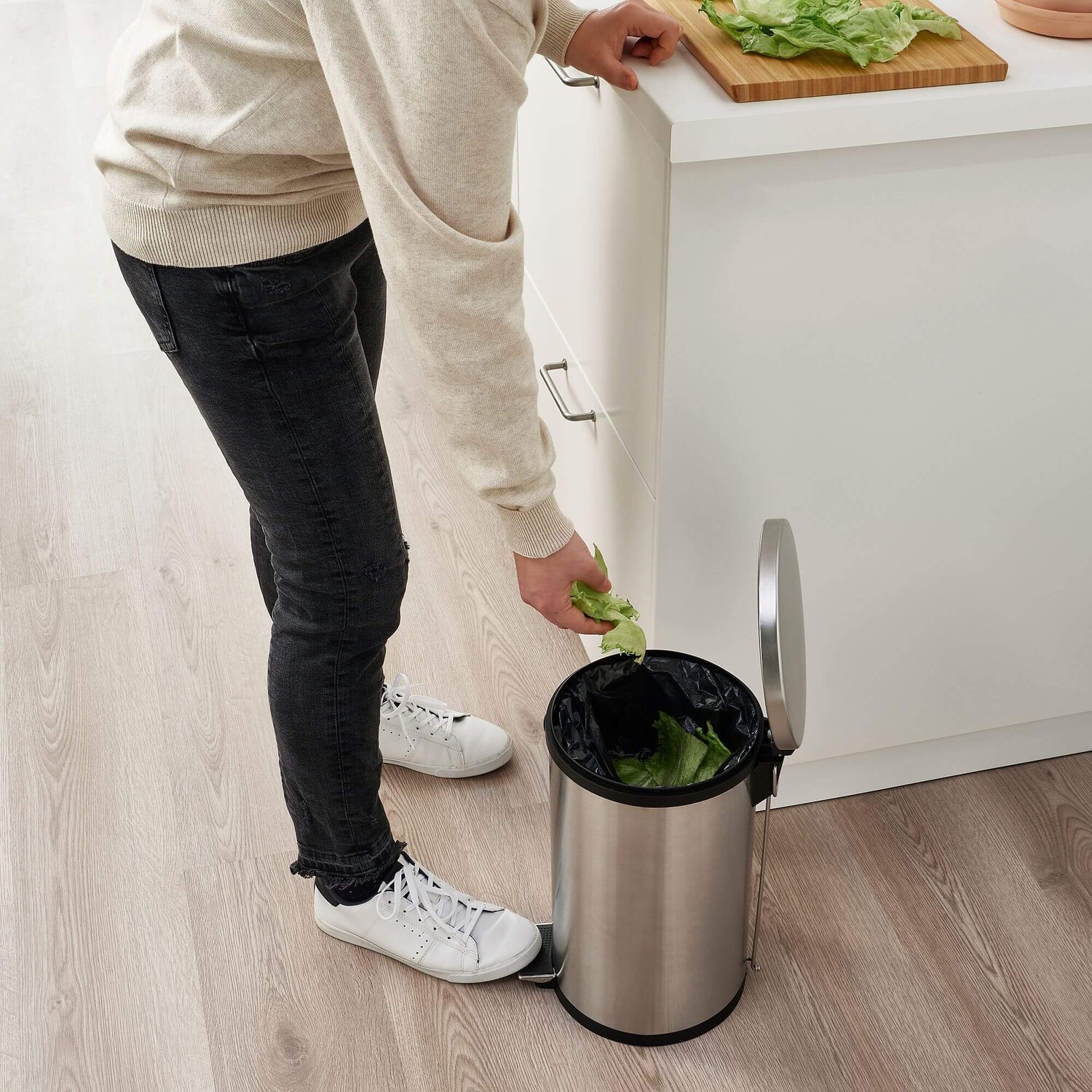 Мусорное ведро лаконичной формы Ikea Snоrpa, которое удобно переносить за ручку, будет прекрасно смотреться как на кухне, так и в ванной.