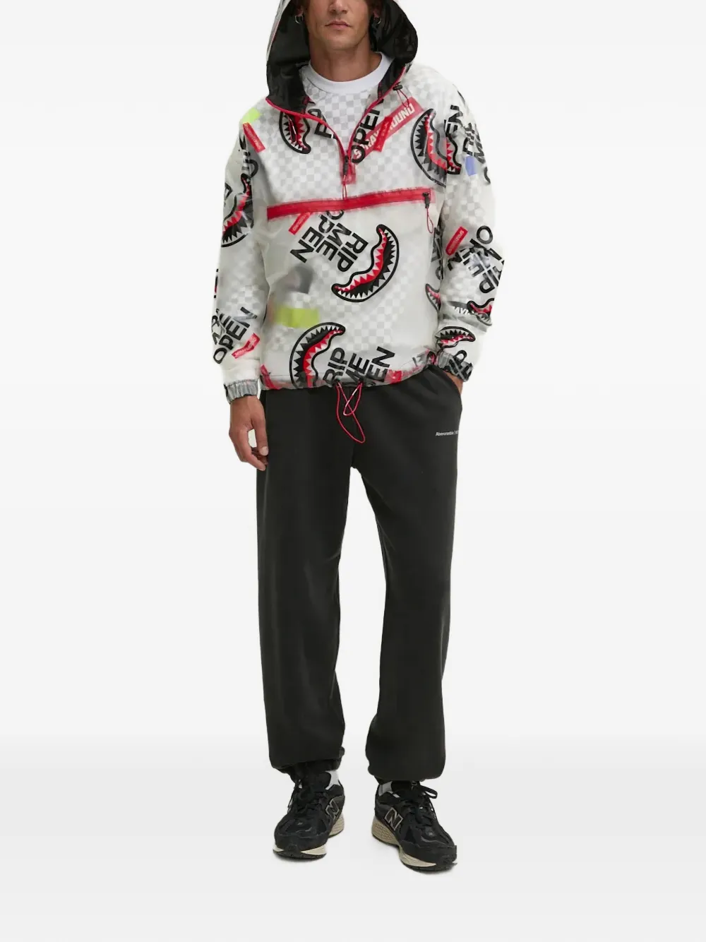 Белый цвет, графичный принт, частичная молния, передний карман, кулиска по низу