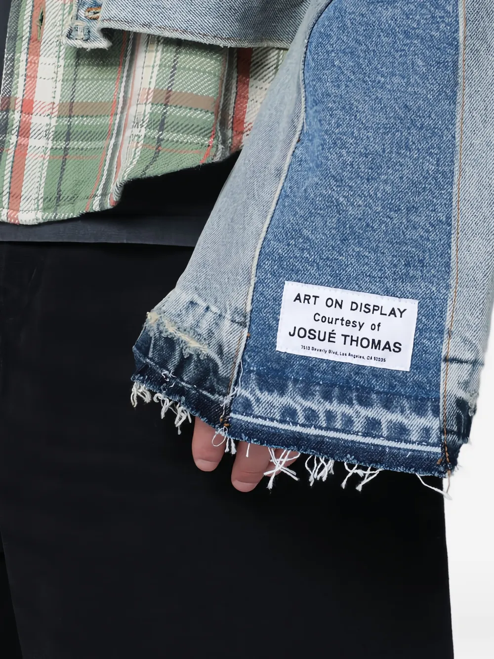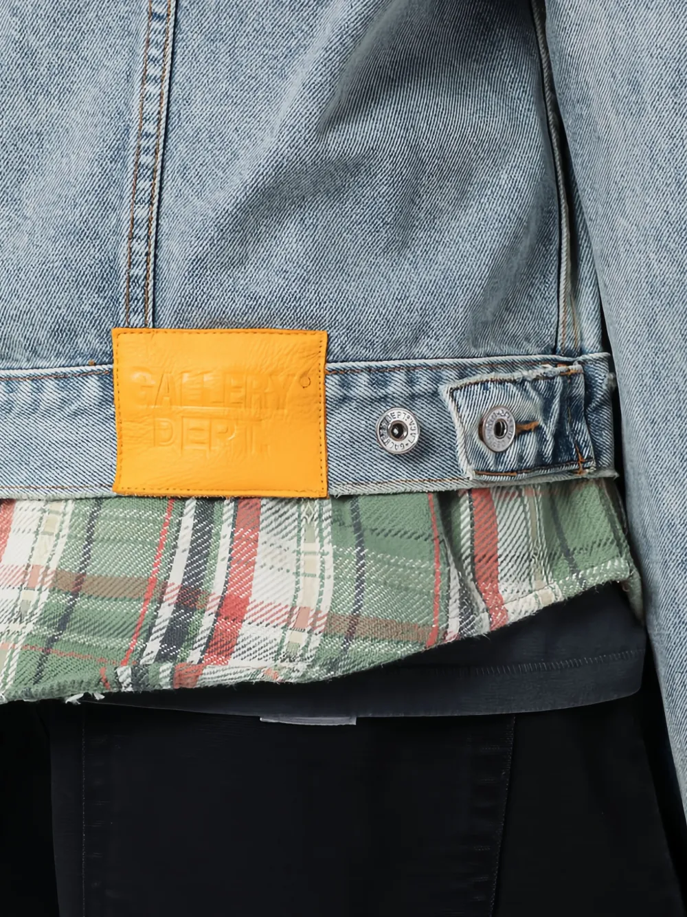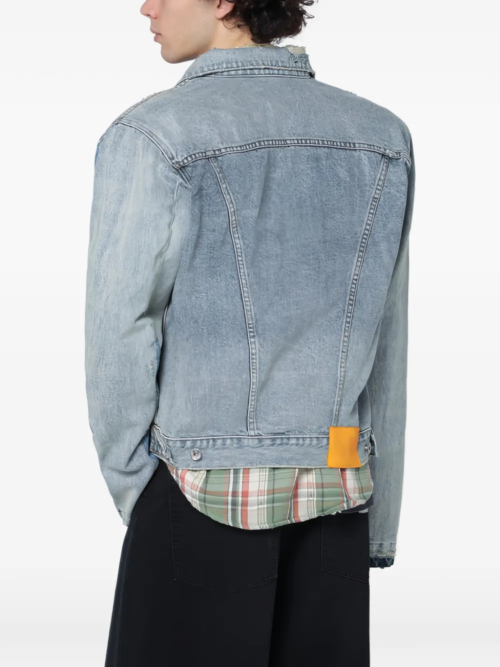 Светло-голубой с необработанным краем, застежкой на пуговицы спереди и накладным нагрудным карманом