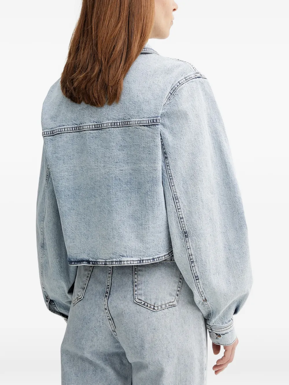 Светло-голубой цвет, нагрудные клапанные карманы, застежка на пуговицы, длинные рукава-буфы, многослойная конструкция