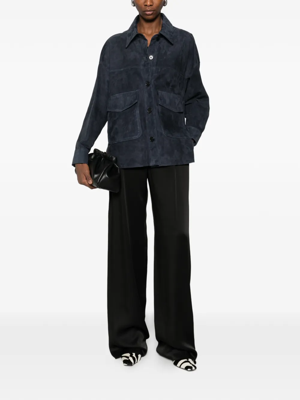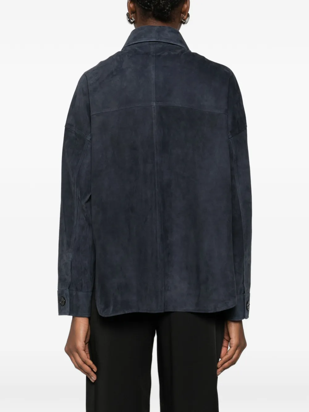 Королевский синий цвет, воротник с острыми концами, застежка на пуговицы, два передних накладных кармана с клапанами, длинные рукава, манжеты на пуговицах
