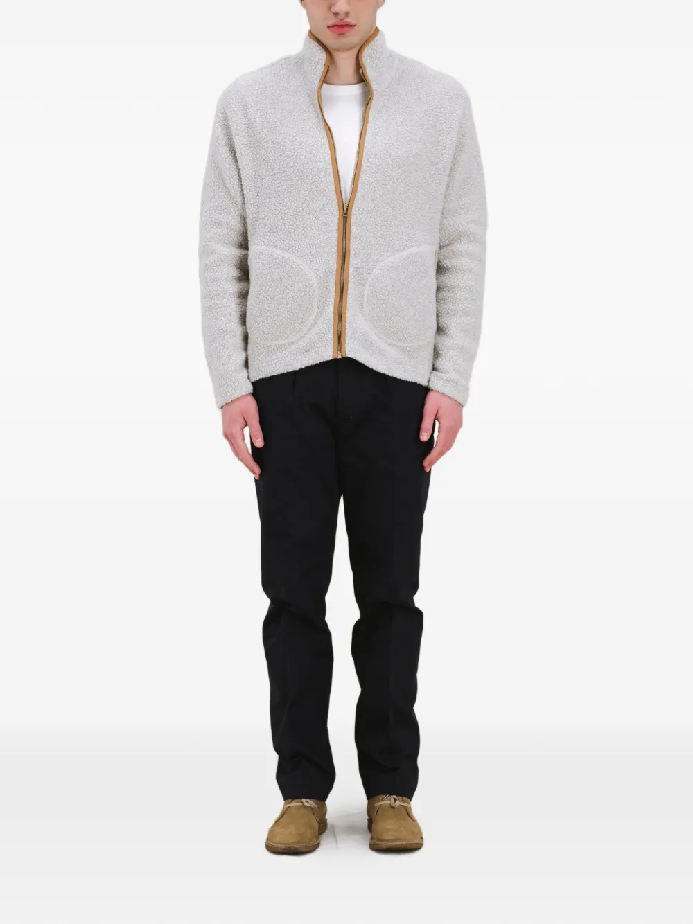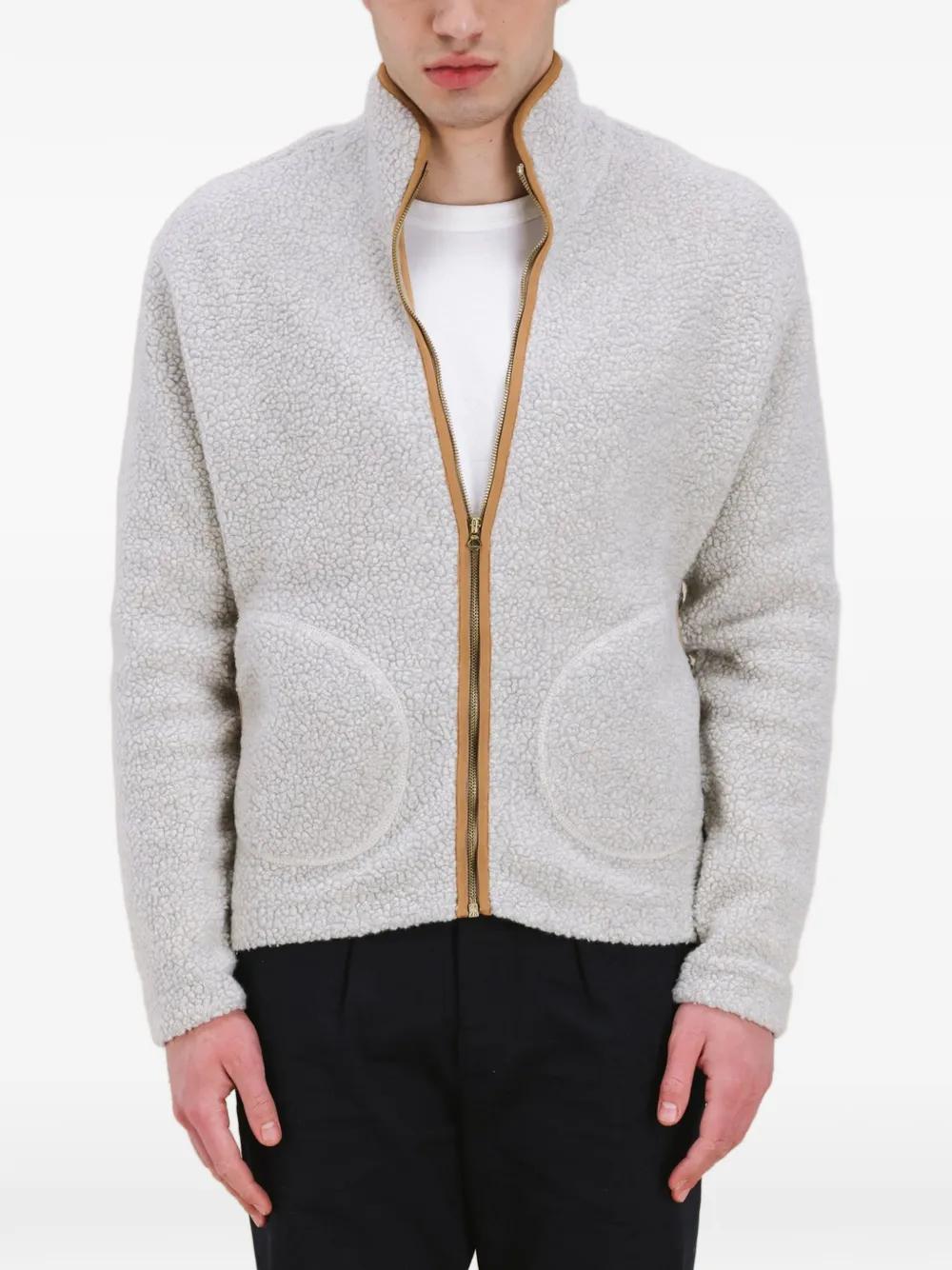 Серый цвет, воротник-воронка, косые прорезные карманы, застежка-молния, текстурированная поверхность