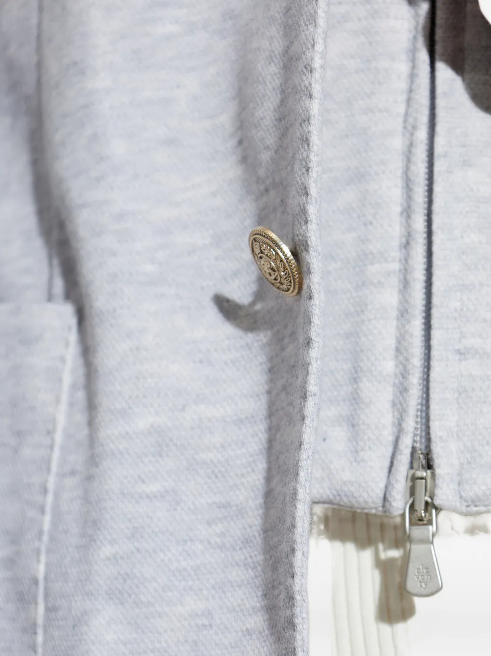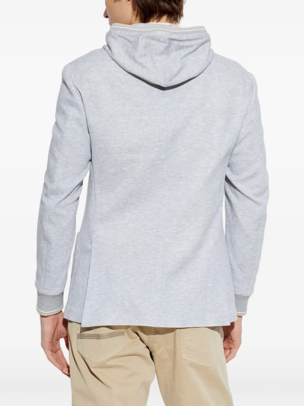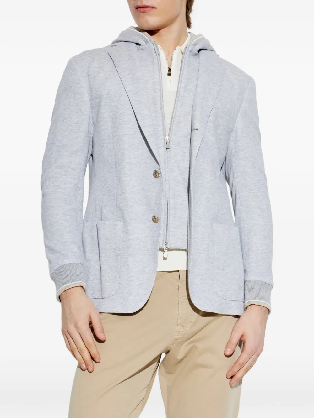 Светло-серая толстовка с капюшоном, ребристыми манжетами, накладными карманами спереди, застежкой на пуговицы и молнией