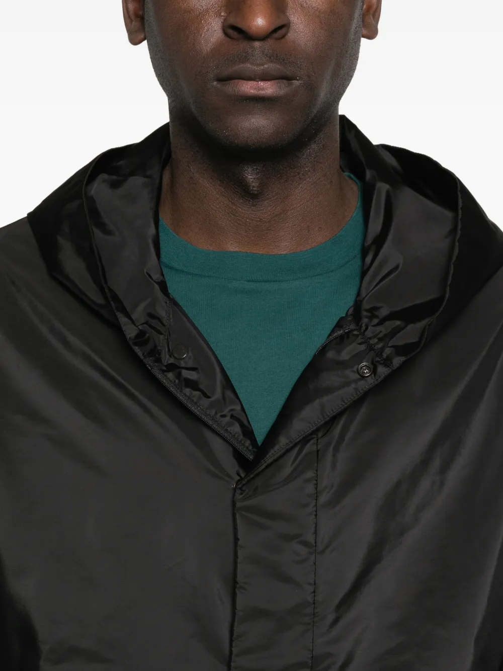 Черный с капюшоном, застежка на пуговицы спереди, боковые прорезные карманы, длинные рукава, эластичные манжеты