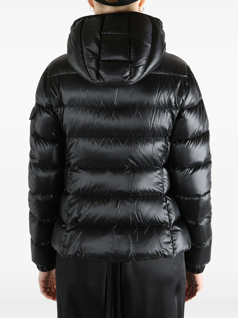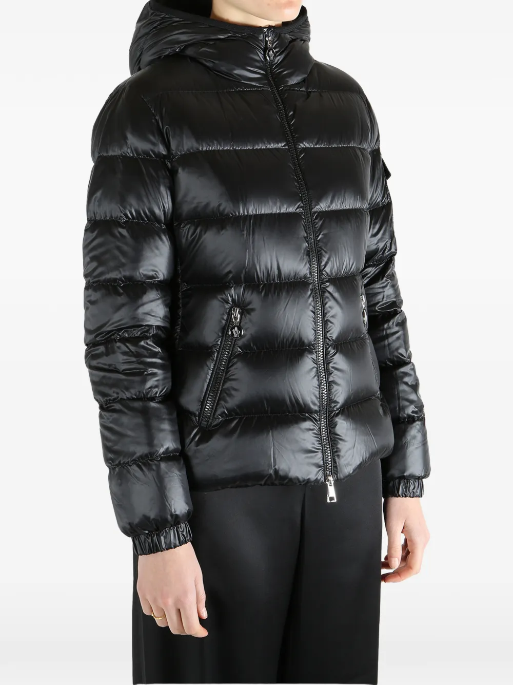 Черный стеганый дизайн, капюшон, застежка-молния спереди, боковые карманы на молнии, нашивка с логотипом на рукаве