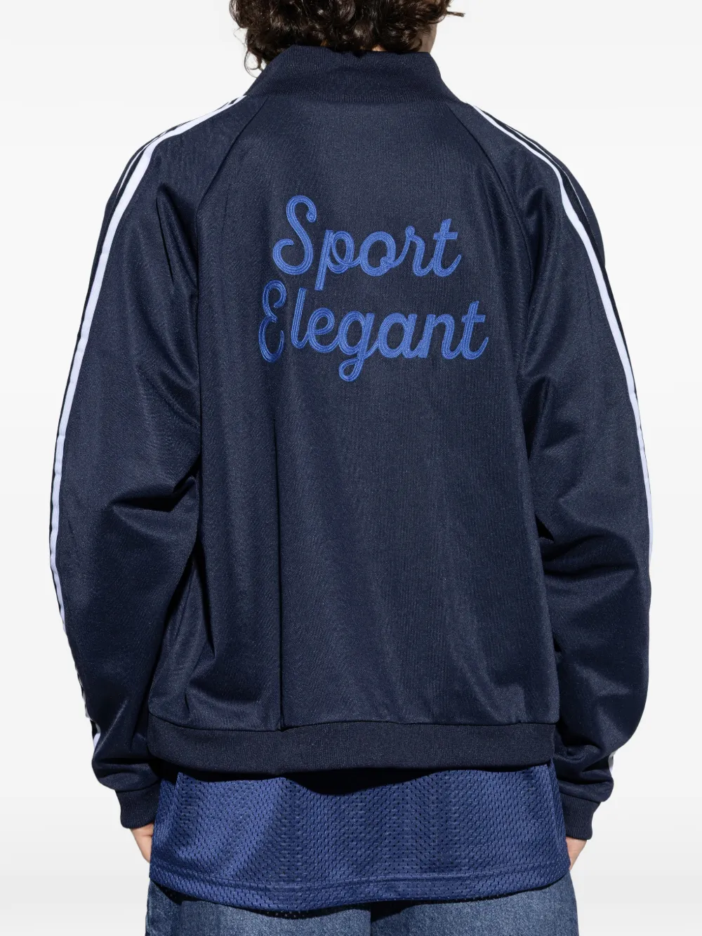 Темно-синий свитер с полосатыми рукавами, застежкой-молнией, вышитым логотипом на круглом вырезе и эластичным подолом