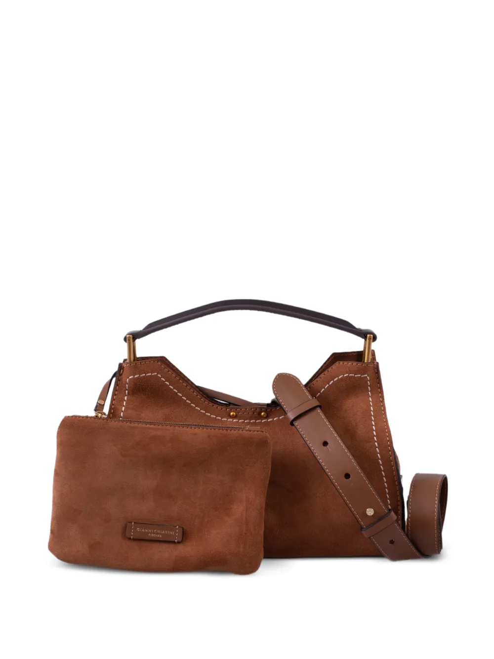 Карамельно-коричневая сумка с верхней ручкой, съемным и регулируемым плечевым ремнем, фурнитурой золотистого цвета и съемным мешочком