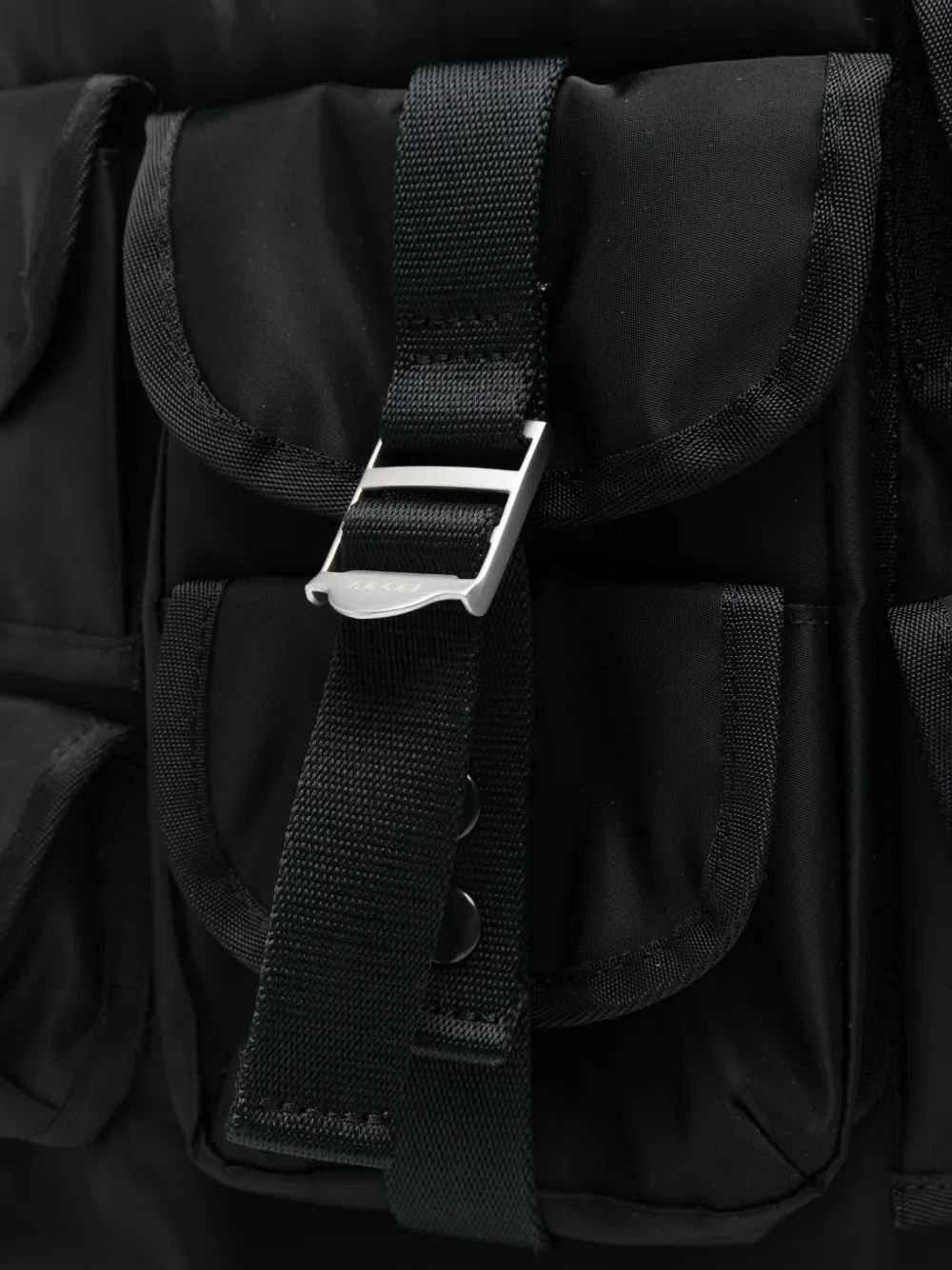 Черная сумка с несколькими карманами, верхней ручкой, пряжкой и фурнитурой серебристого оттенка