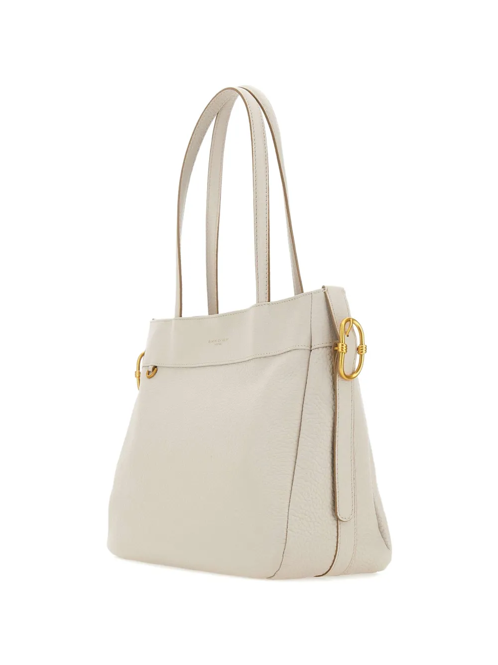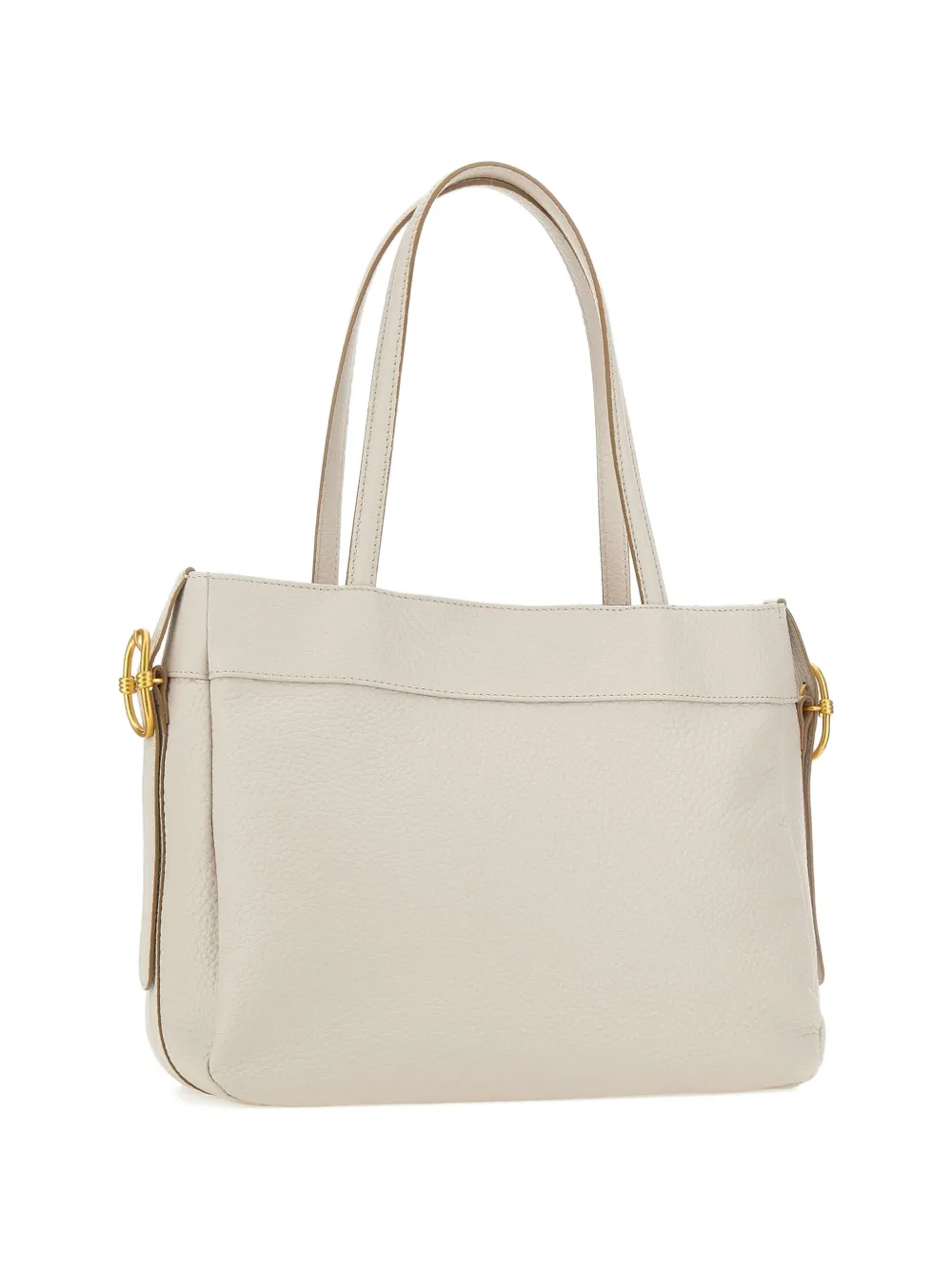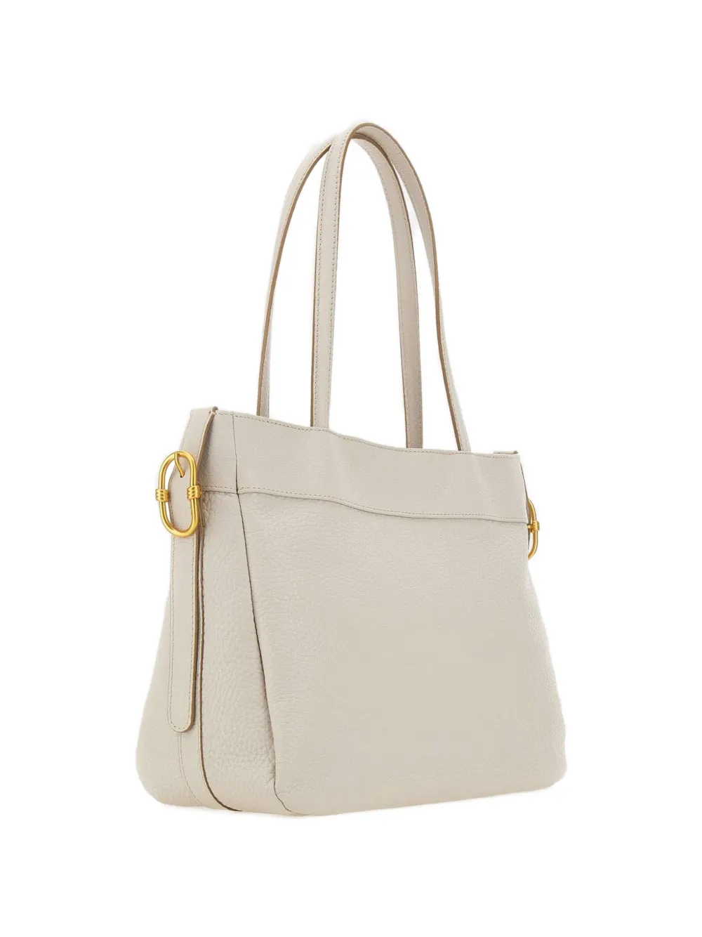 Белая сумка с зернистой текстурой, двумя верхними ручками, фурнитурой цвета золота, декоративной пряжкой и внутренним карманом на молнии