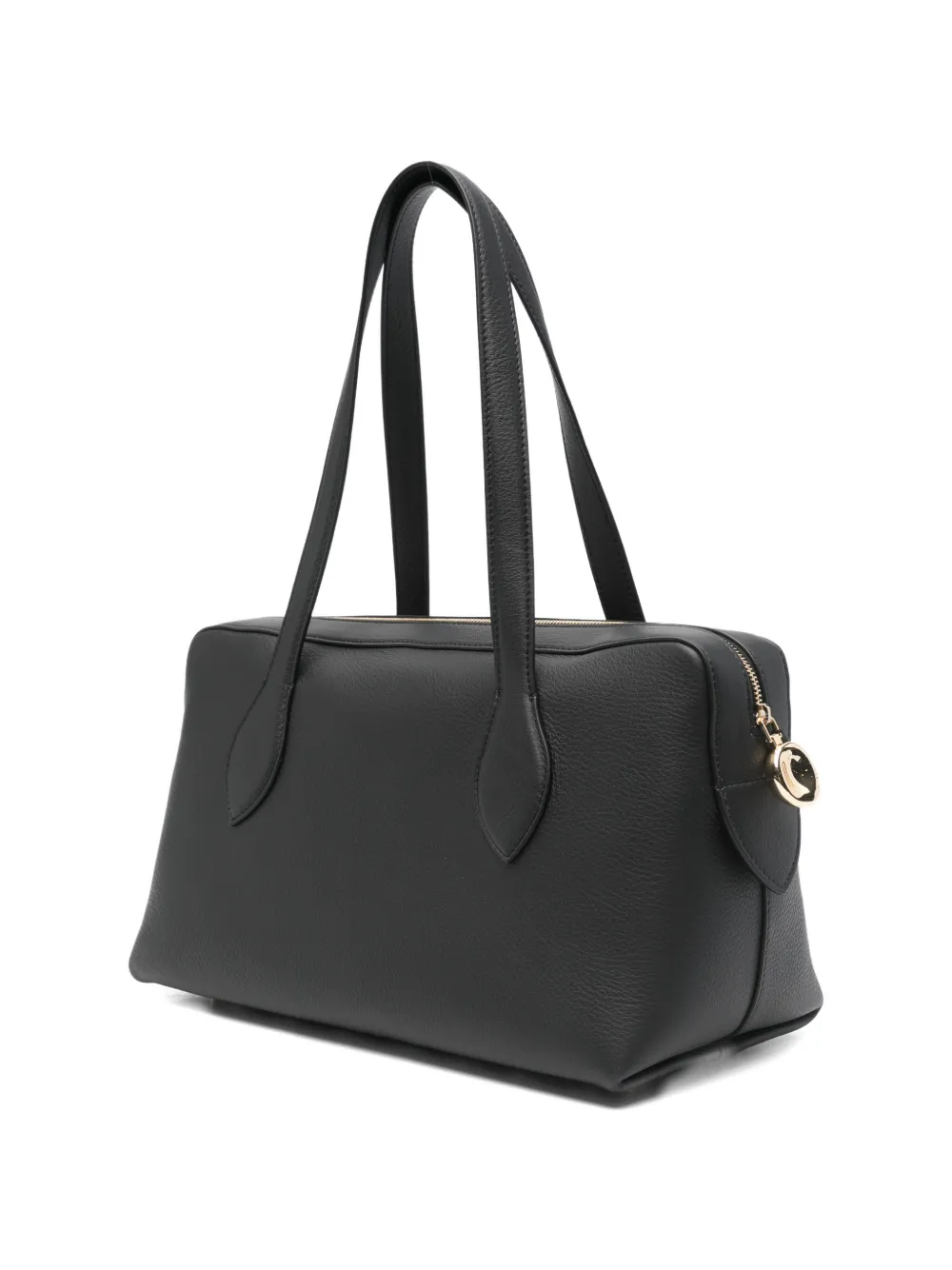 Черные кожаные верхние ручки, застежка-молния, фурнитура с золотистым покрытием. В комплект входит защитный мешок для хранения.