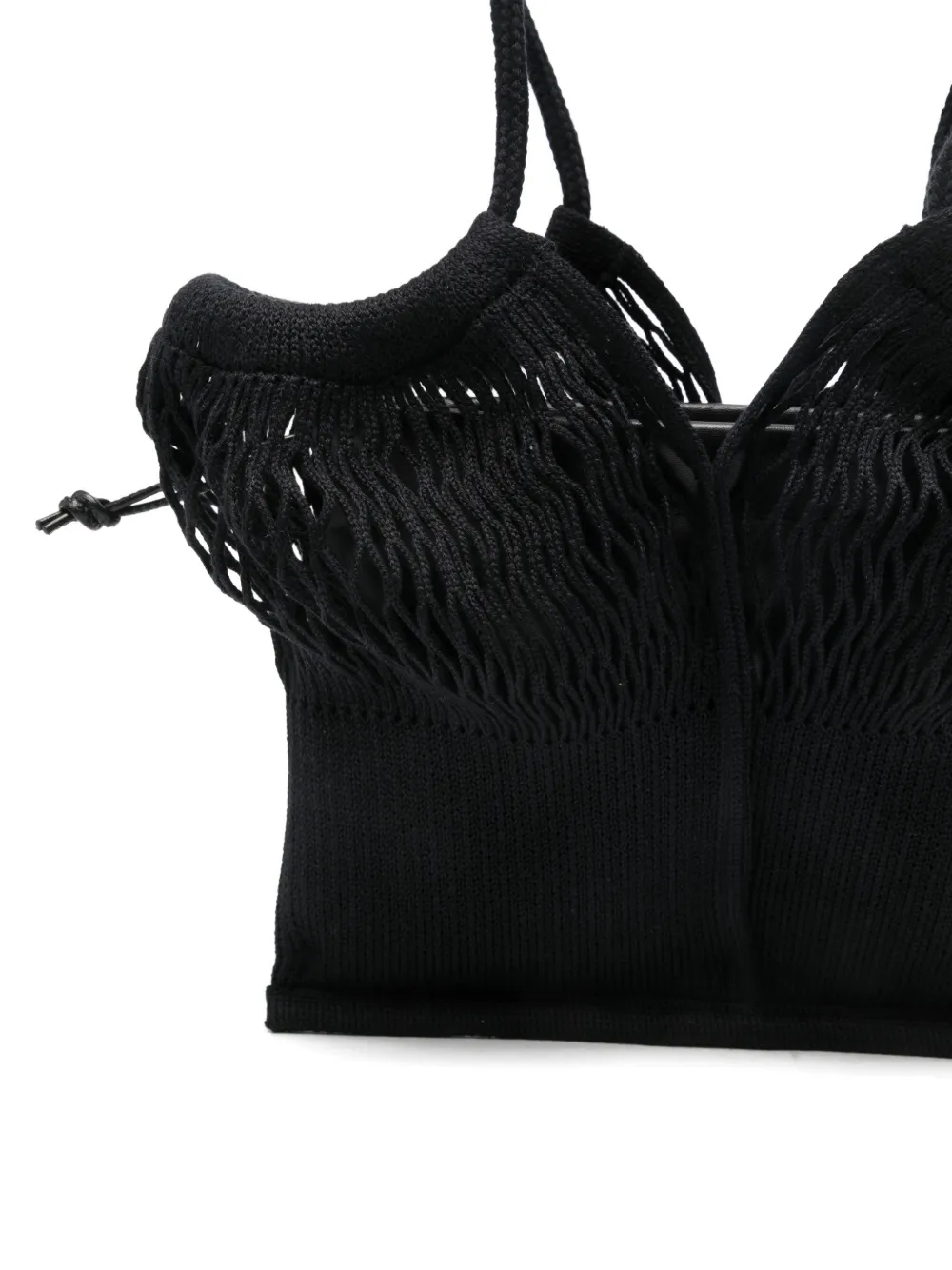Черные ручки из веревки с сетчатыми деталями, застежка на кулиску. К изделию прилагается защитный чехол для хранения.