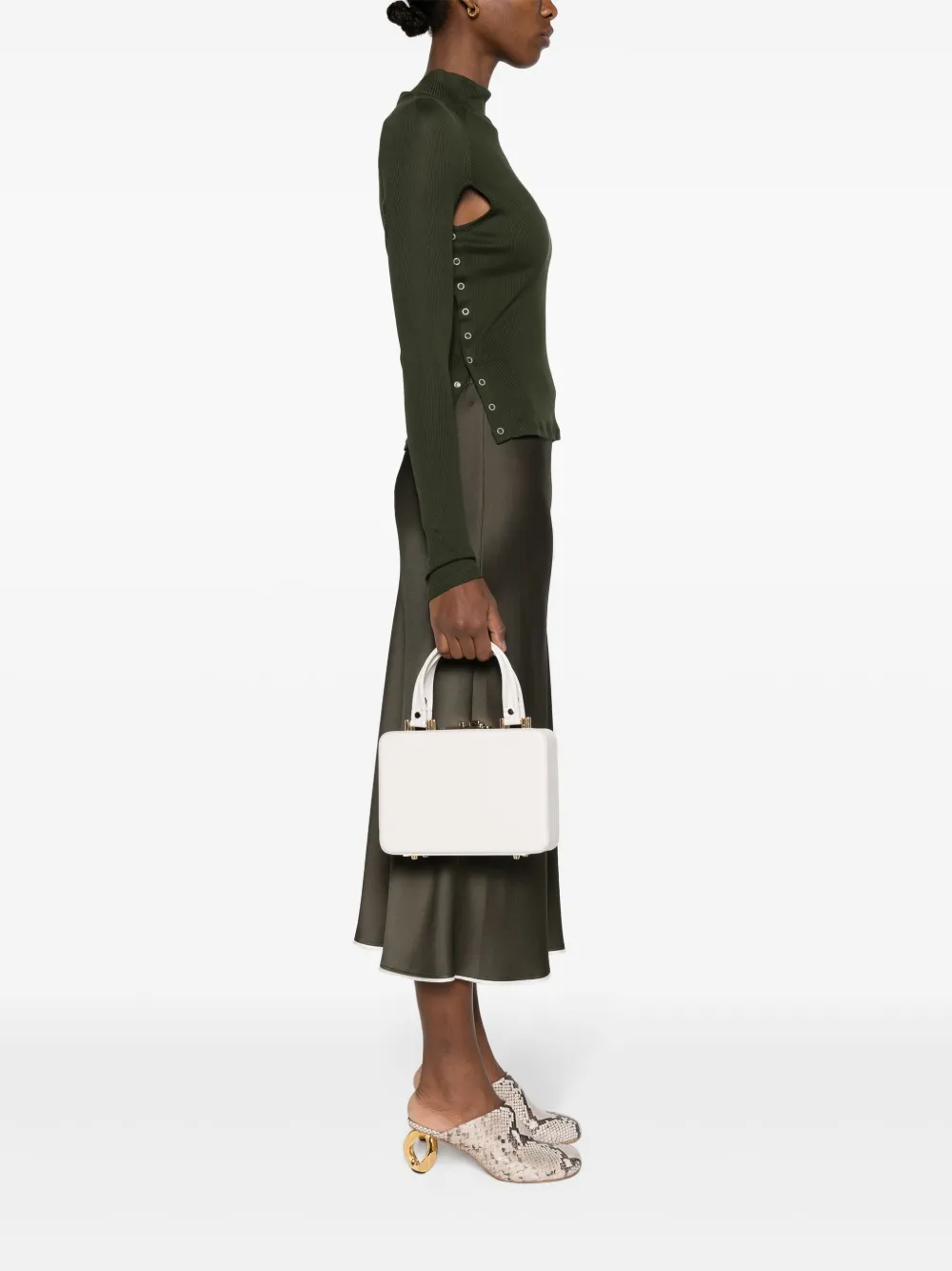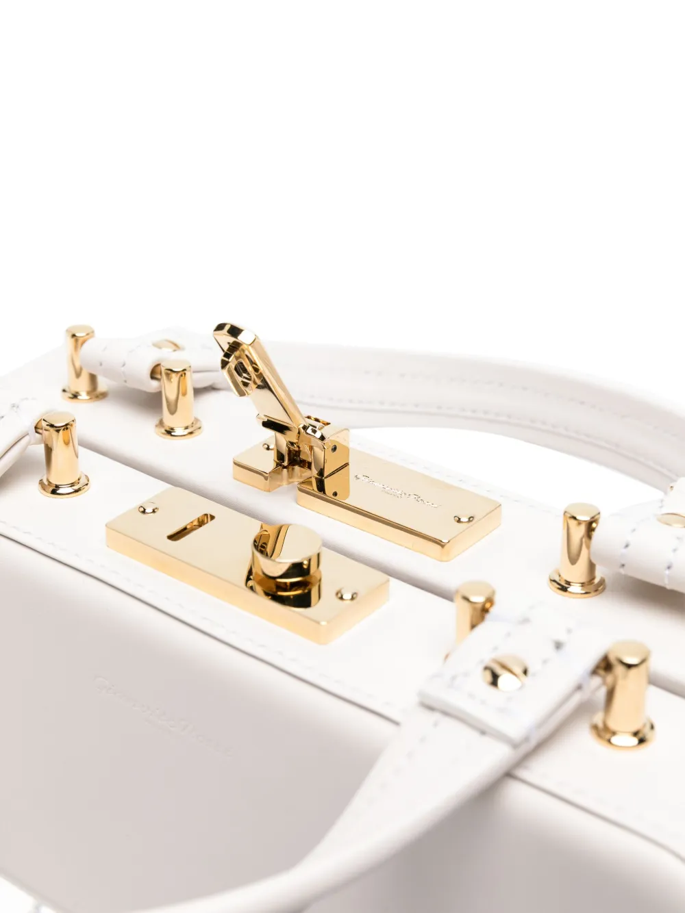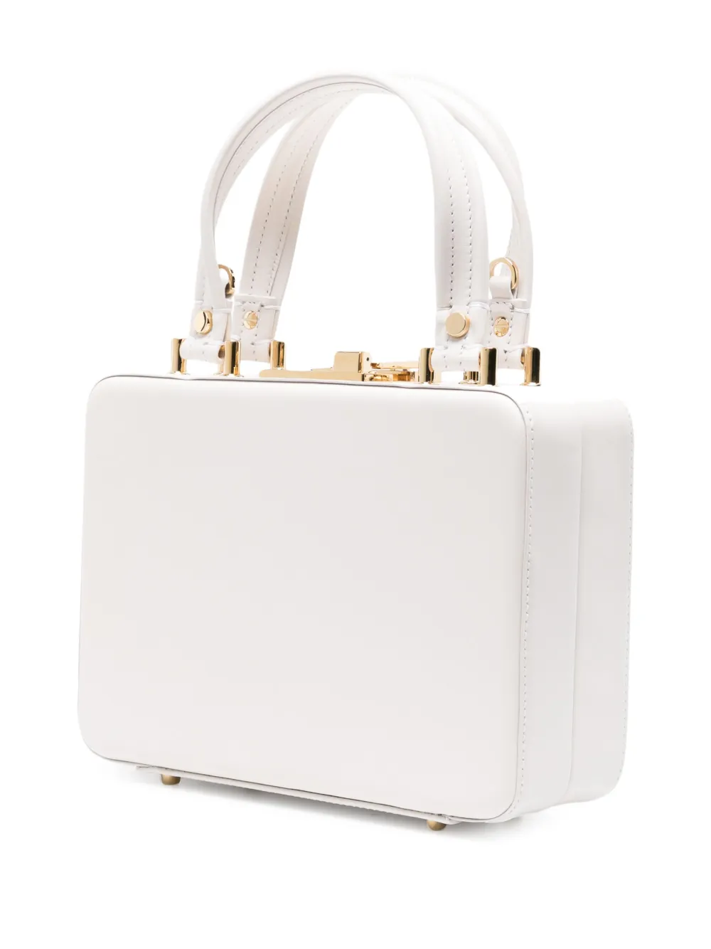 Подробнее о товаре: - белый - телячья кожа - гладкая текстура кожи - тисненый логотип спереди - застежка на защелку - пряжка с выгравированным логотипом - складки - съемный регулируемый ремень на плечо - две верхние ручки - основное отделение - внутренний накладной карман - тисненый логотип внутри - прямоугольная форма - металлические ножки - золотистая фурнитура - В комплект входит мешок-пыльник для хранения.