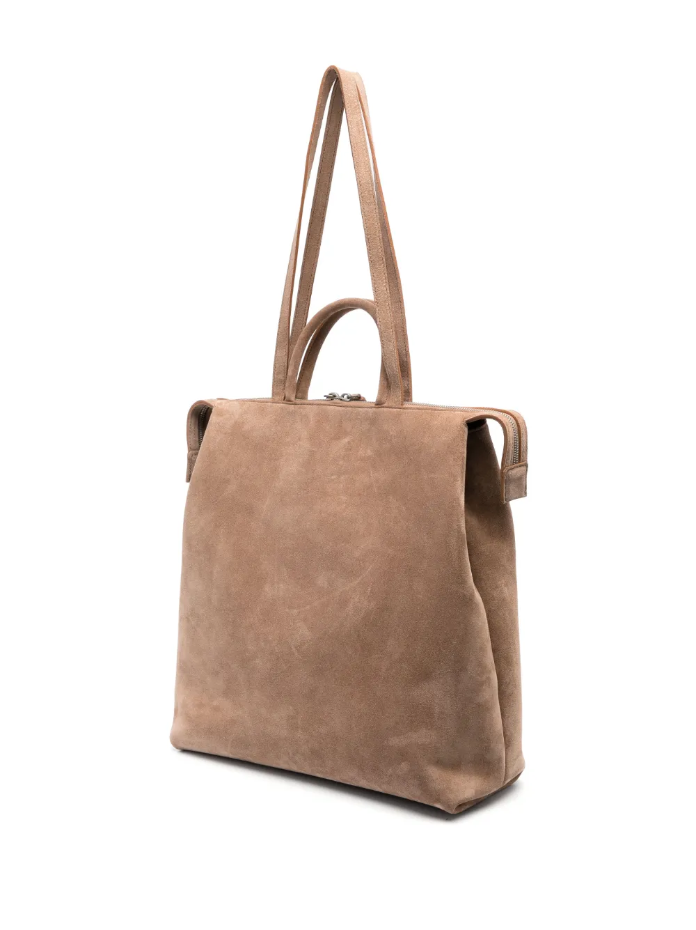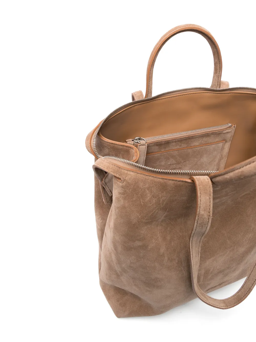 Расцветка Light Brown, телячья кожа, замша, тисненый логотип спереди, серебристая фурнитура, застежка на молнии сверху, две закругленные верхние ручки, две длинные верхние ручки, внутренний карман на молнии и основное отделение.