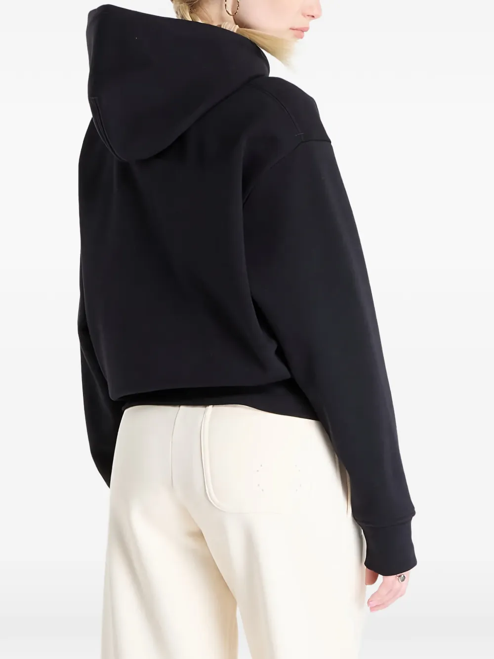 Черный худи с кулиской, длинные рукава, передний накладной карман, ребристый низ