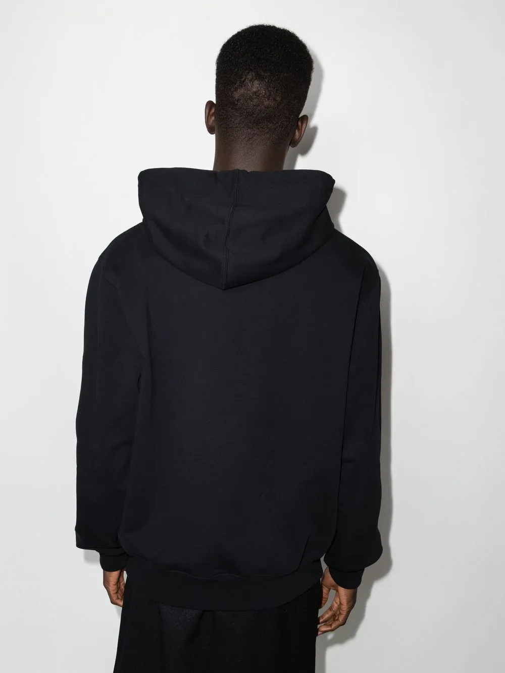 Черный, эластичный хлопок, затягивающийся на шнурок капюшон, логотип спереди, карман-муфта, длинные рукава и прямой подол.