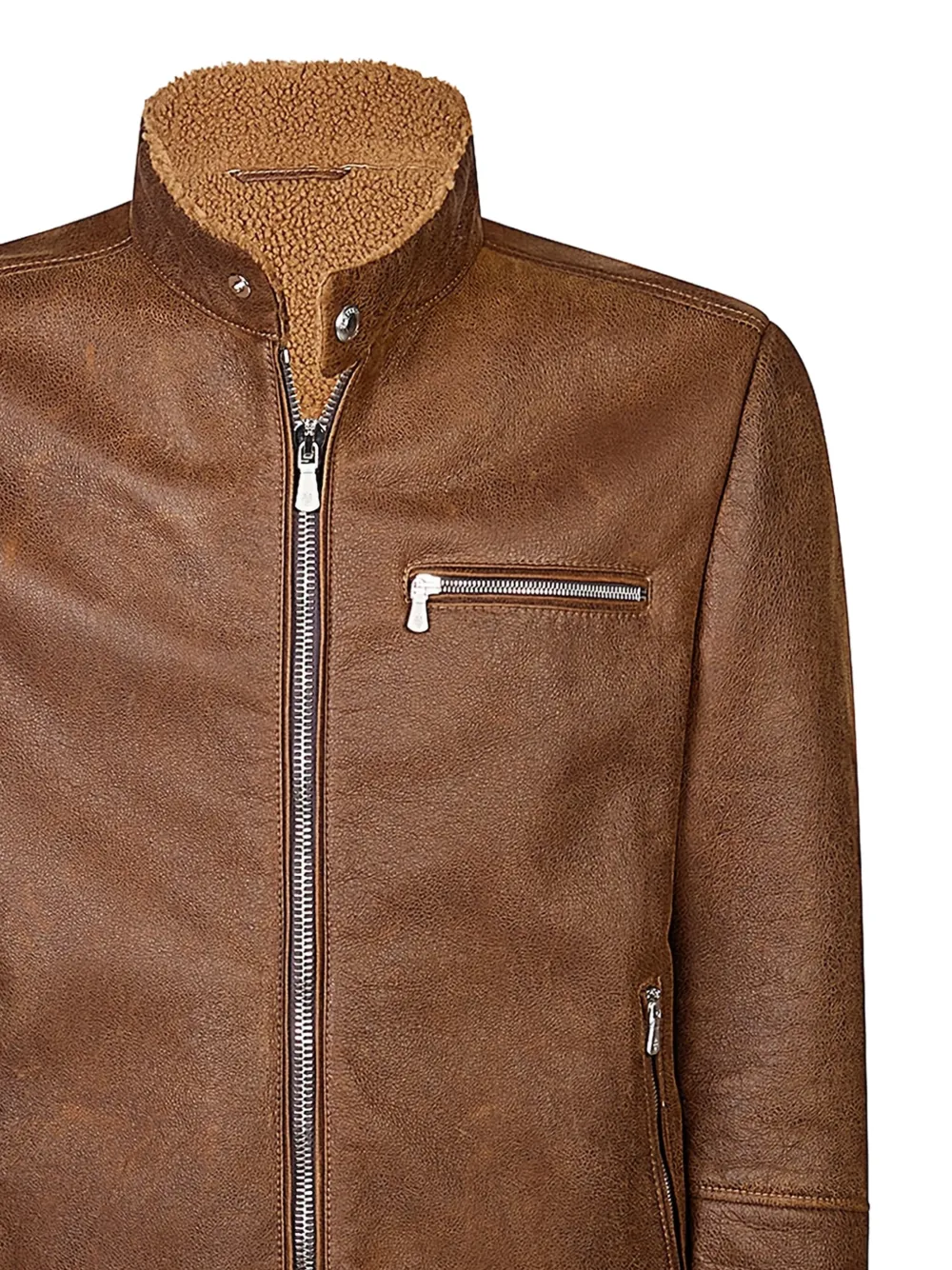 Коричневый цвет, застежка-молния, воротник из овчины, нагрудный карман, боковые карманы на молнии, застежка на пуговицы