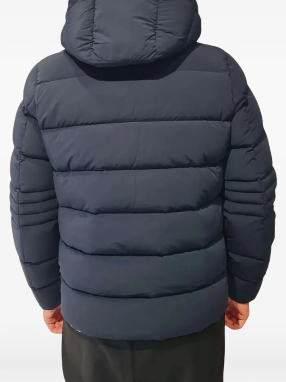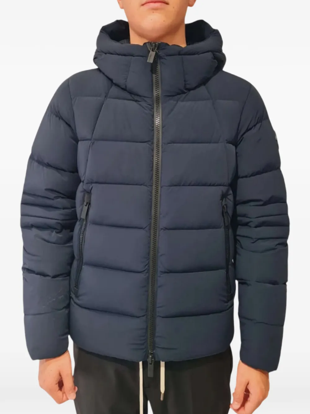 Синий пухлый дизайн, застежка-молния спереди, капюшон, передние карманы на молнии, длинные рукава