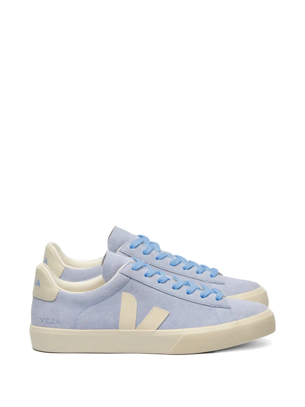 Светло-голубой фирменный элемент V, контрастная пятка, шнуровка спереди, круглый носок, плоская подошва
