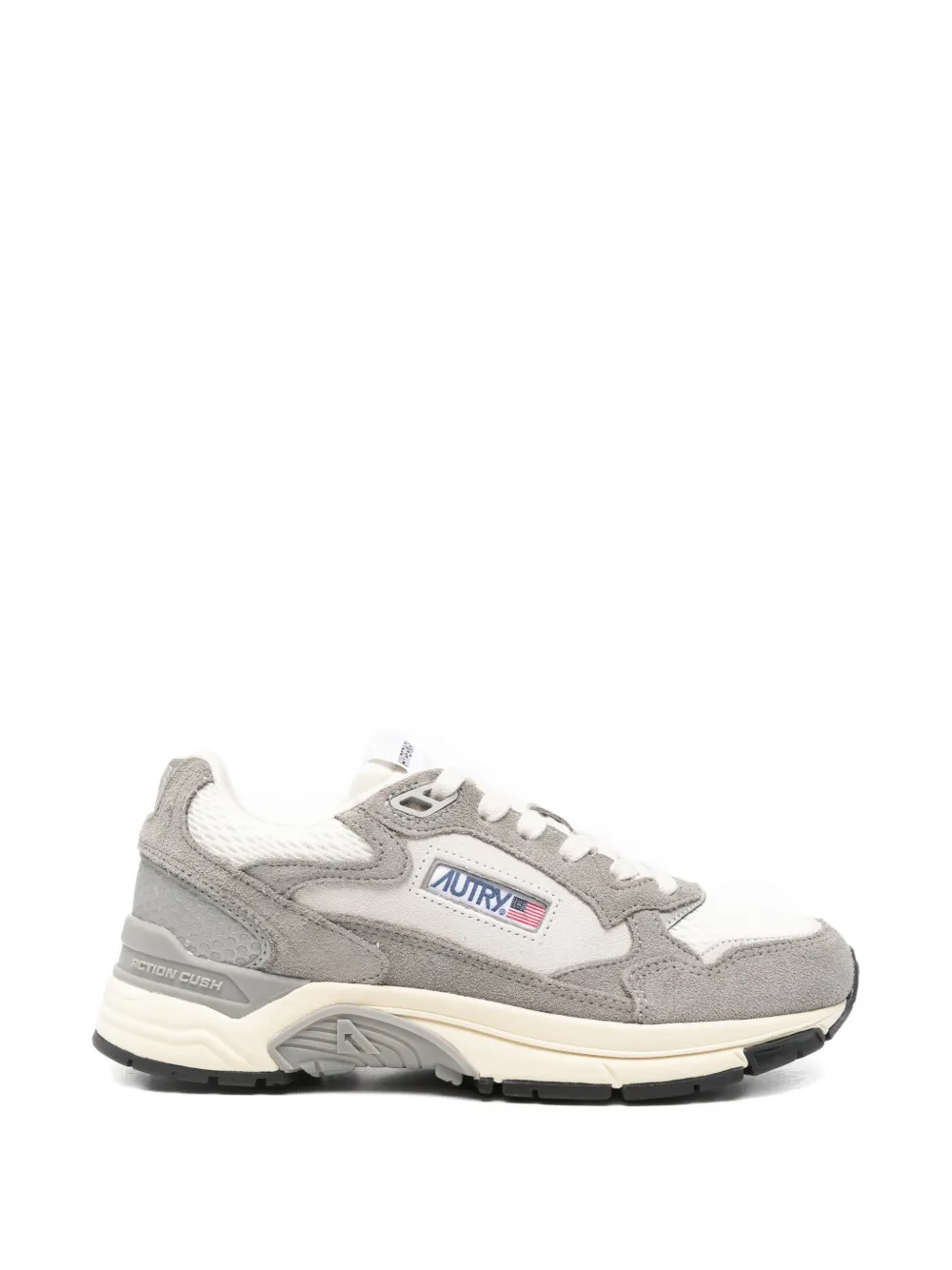 Серый цвет, панельный дизайн, логотип, круглый носок, шнуровка спереди, резиновая подошва