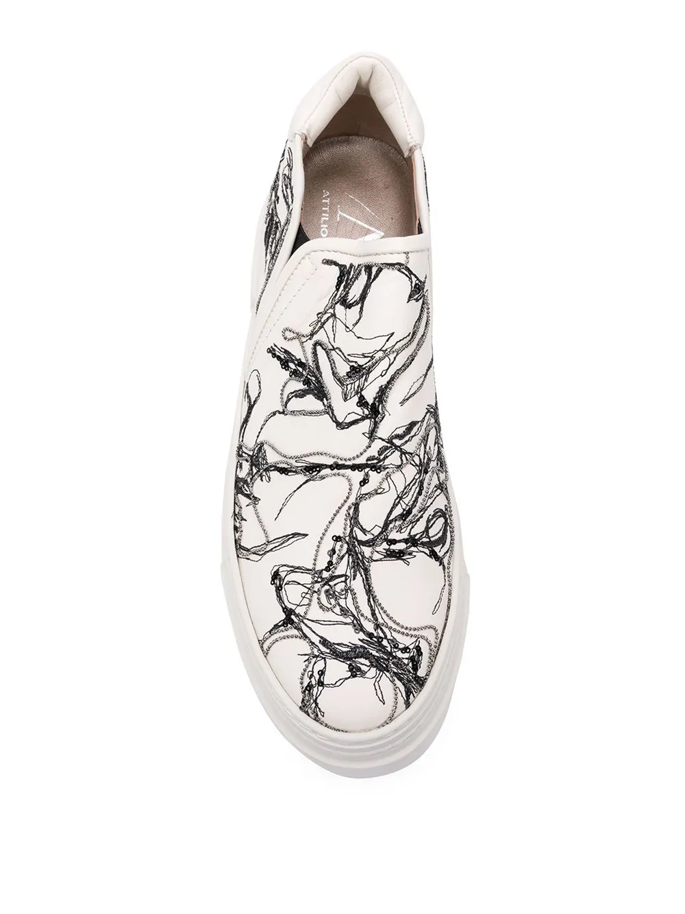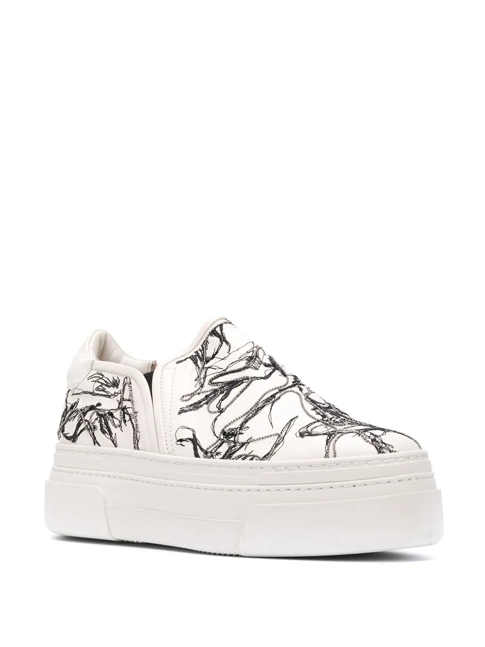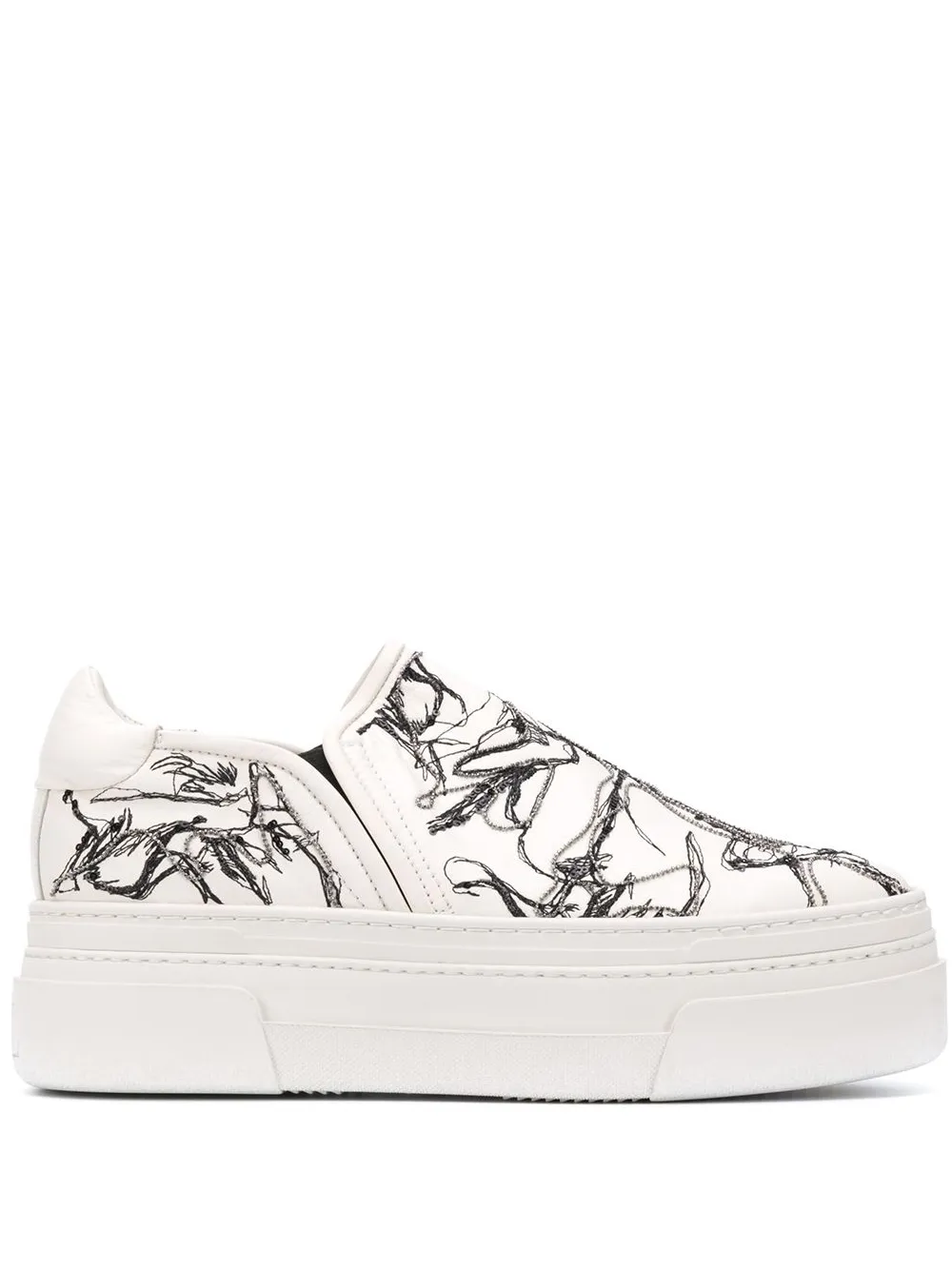 Кеды слипоны на платформе от AGL. Миндалевидный носок, абстрактный принт, украшение из бусин, уплотненная щиколотка и плоская резиновая подошва.