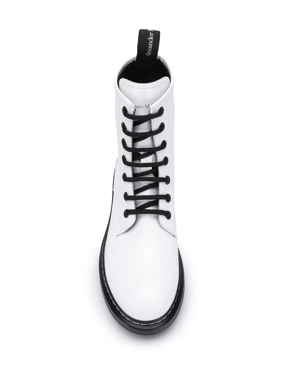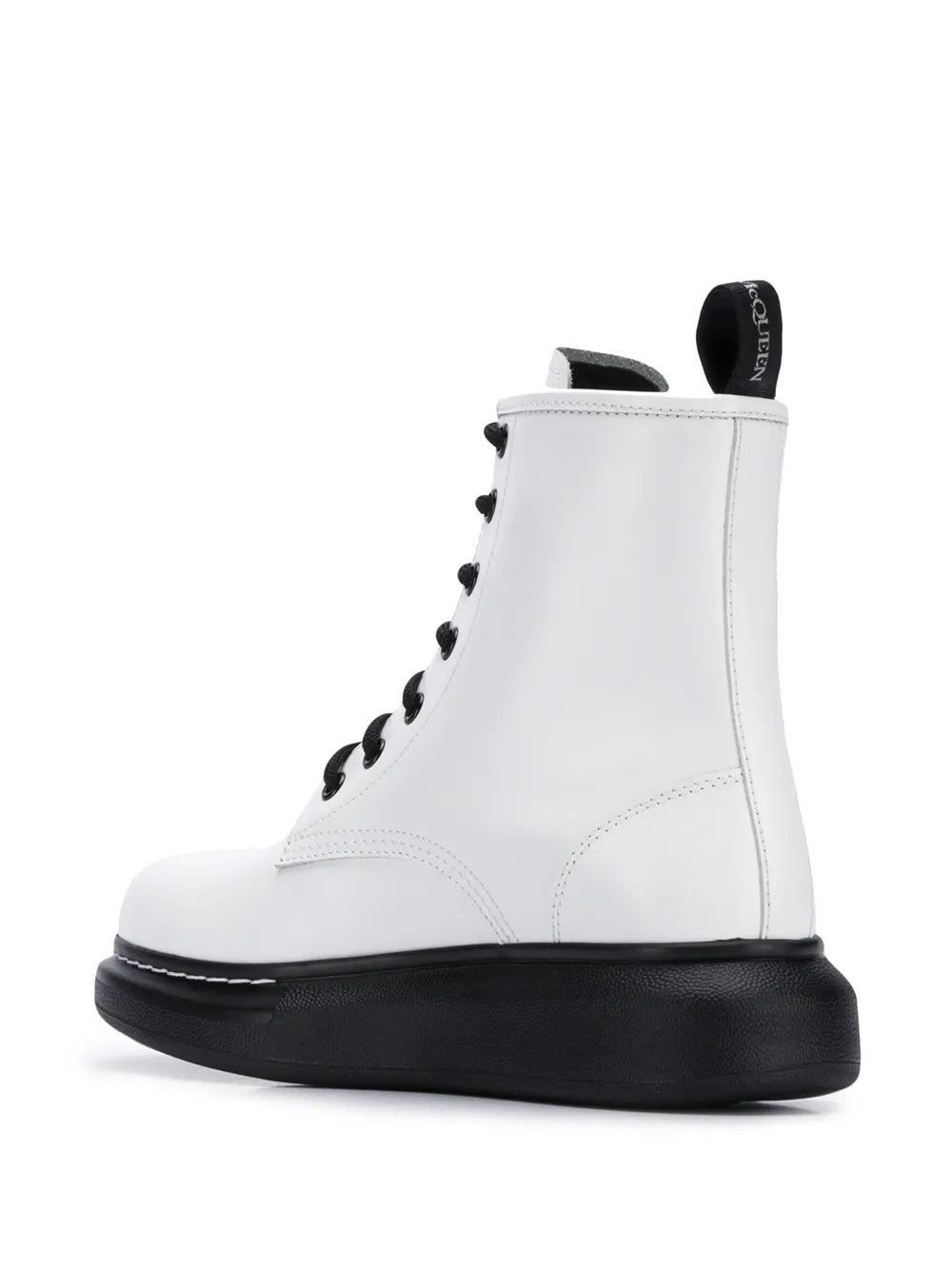 Ботинки на платформе от Alexander McQueen (Александр Маккуин). Закругленный носок, шнуровка спереди, декоративная строчка, петля для подтягивания сзади, язычок с логотипом и плоская резиновая подошва.