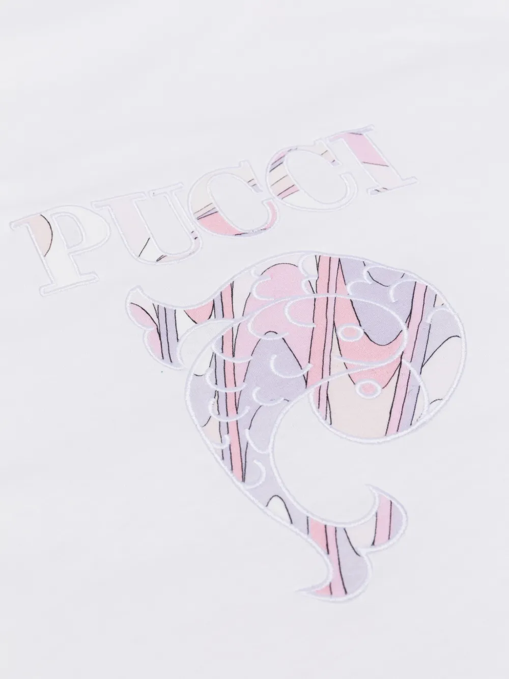 Белый цвет, графический принт, оборки по краю, фирменная надпись логотипа. В комплекте защитный чехол для хранения.