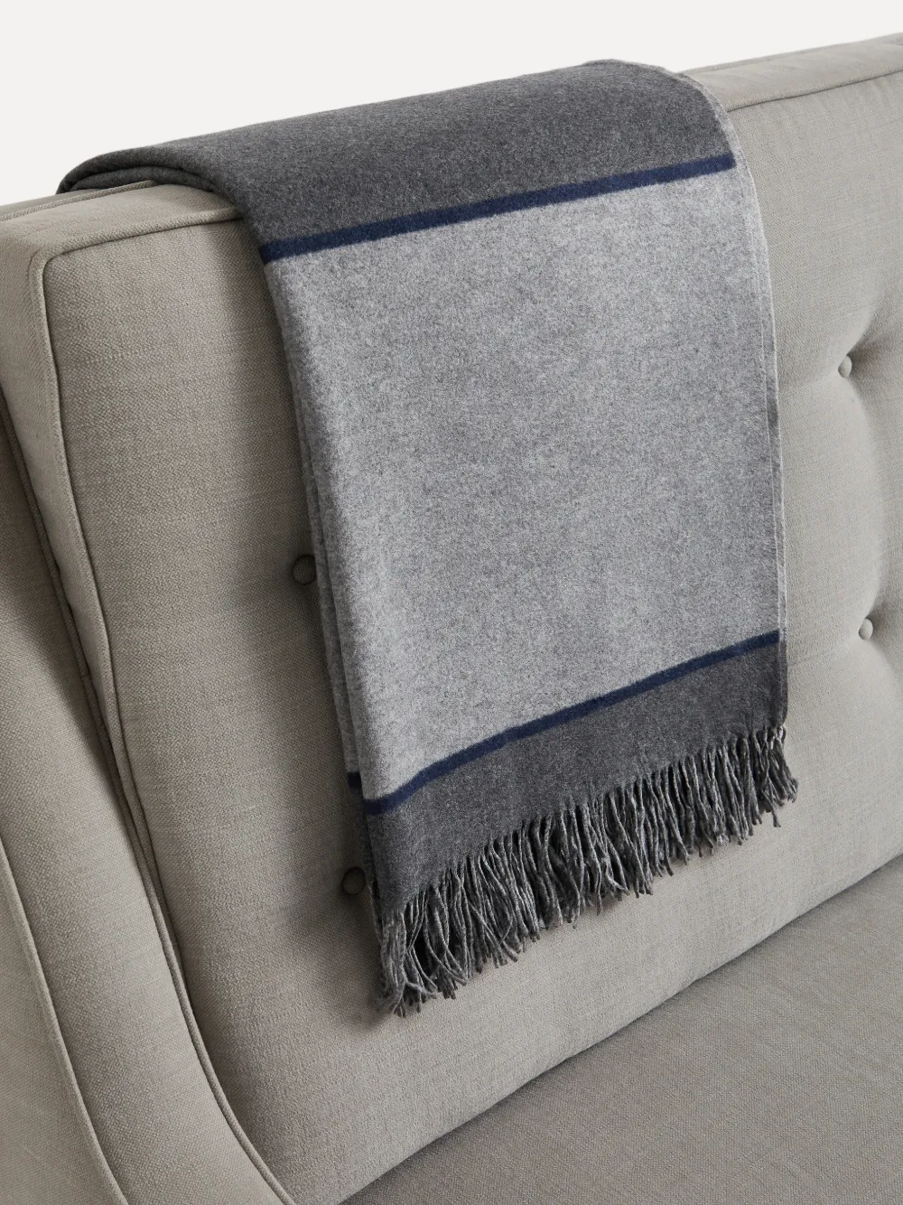 Серый с полосками, шелк с бахромой по краю.