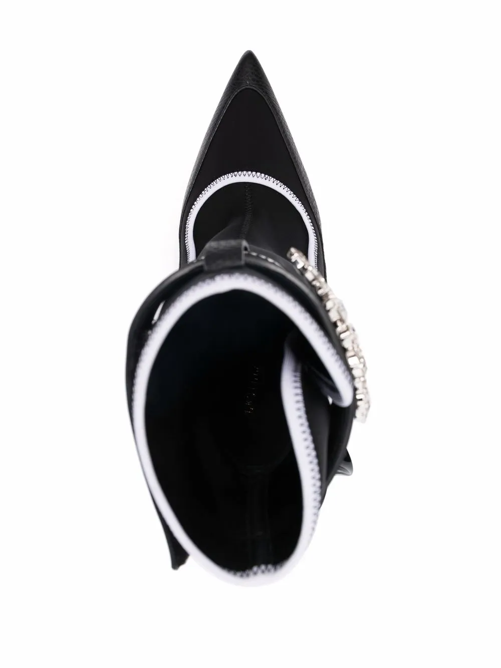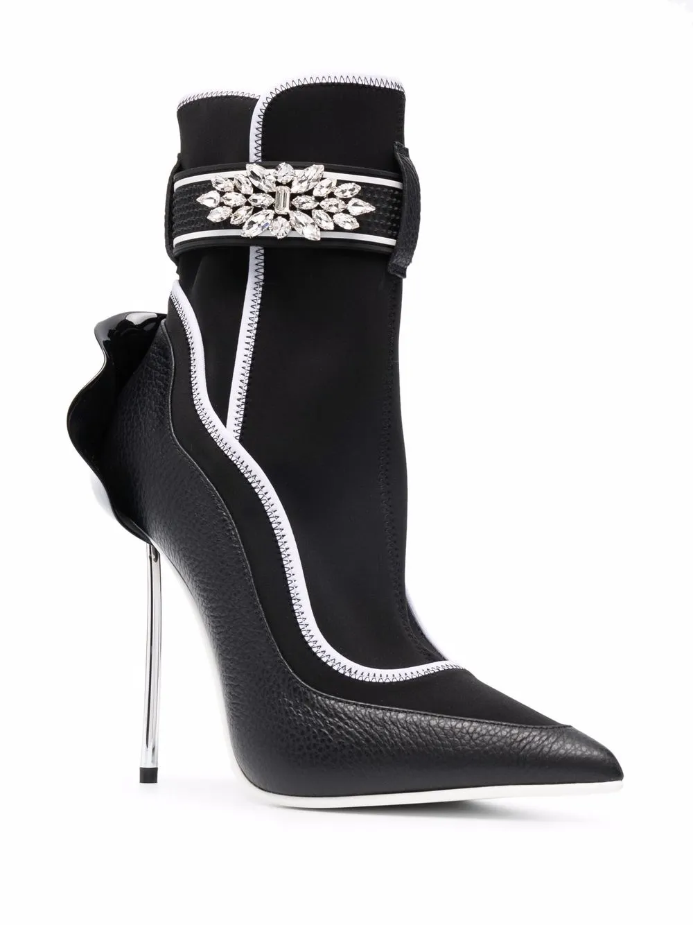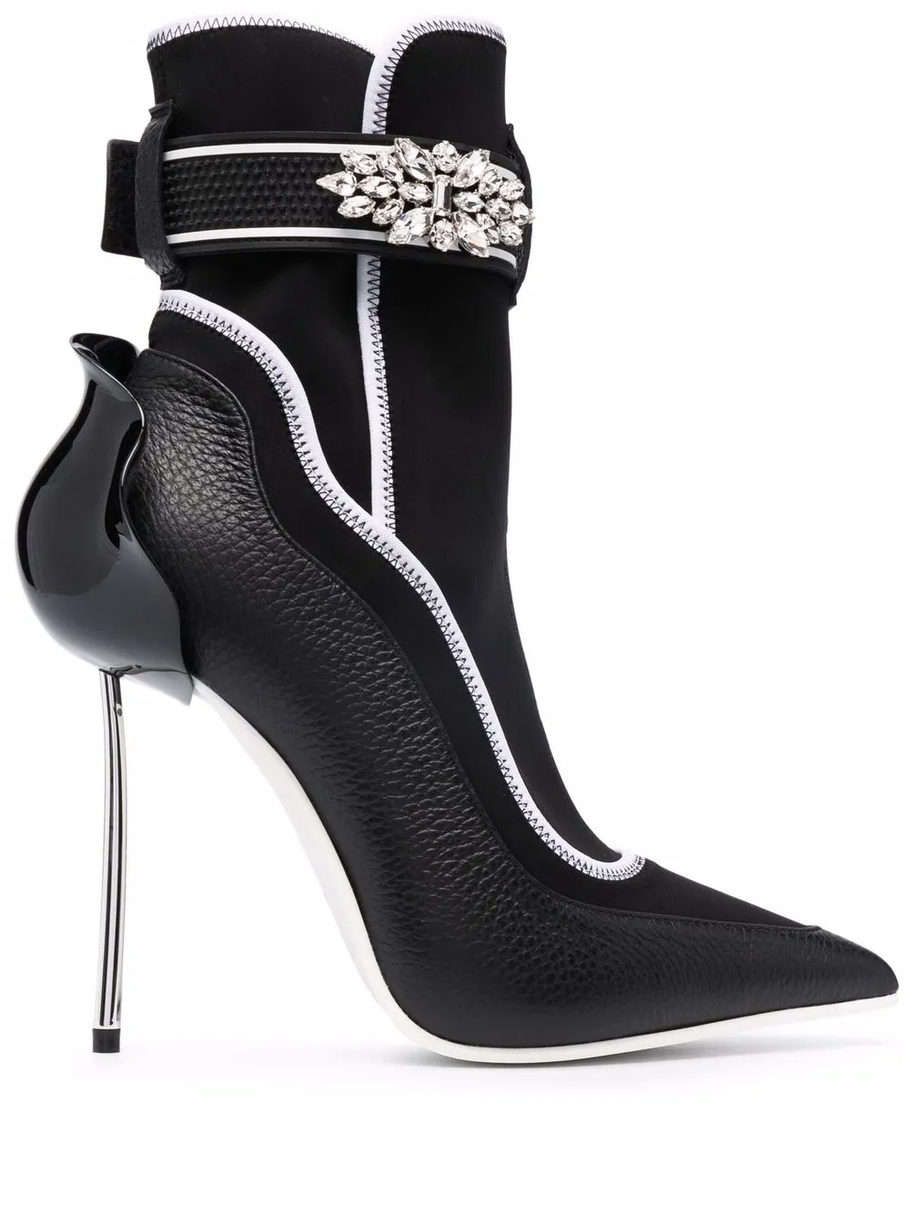 Вставки, контрастная отделка, заостренный носок, ремешок на щиколотке, декор из кристаллов и каблук на высокой шпильке.