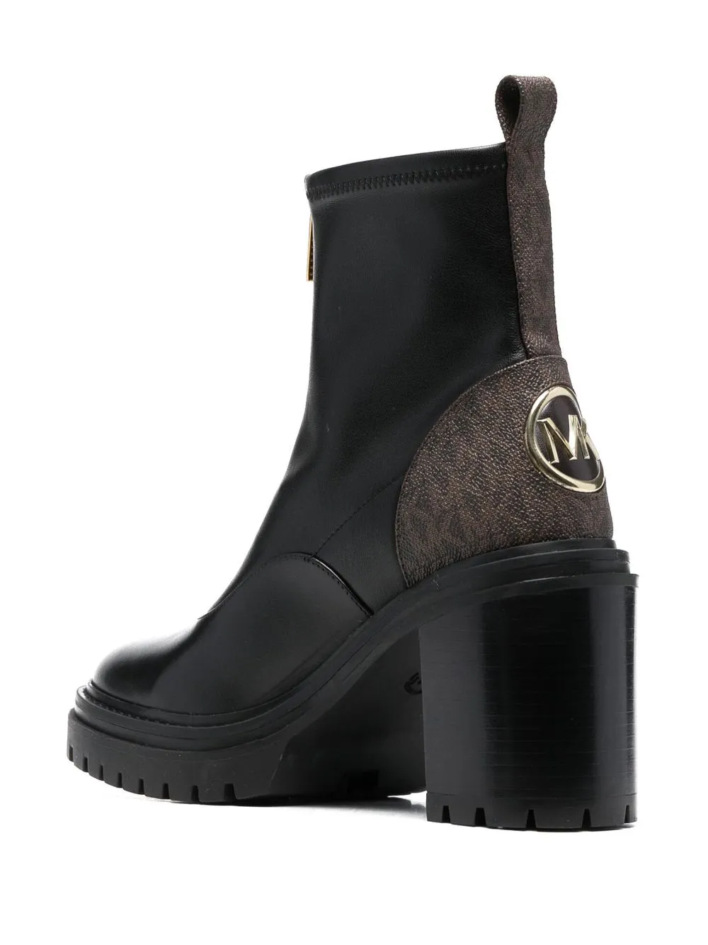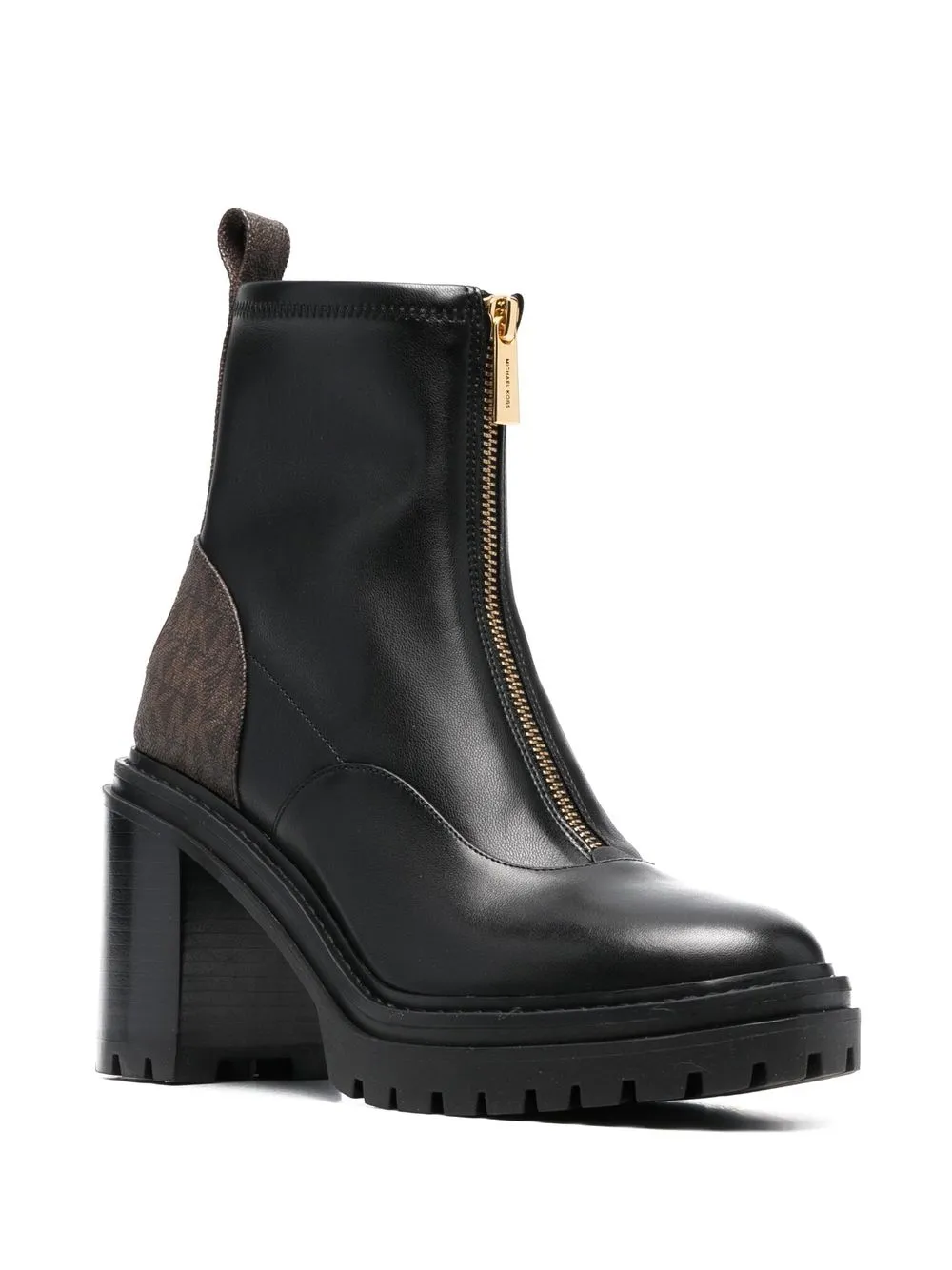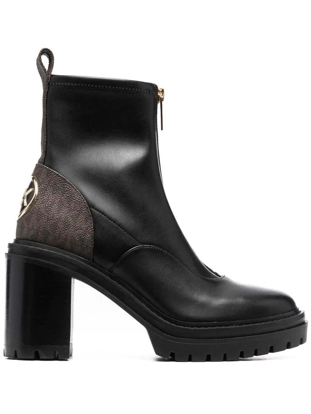 Черный, коричневый, телячья кожа, контрастные вставки, монограмма, золотистый металлический логотип, закругленный носок, застежка на молнии спереди, блочный каблук и петля для подтягивания с логотипом.