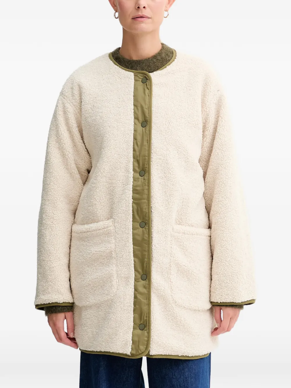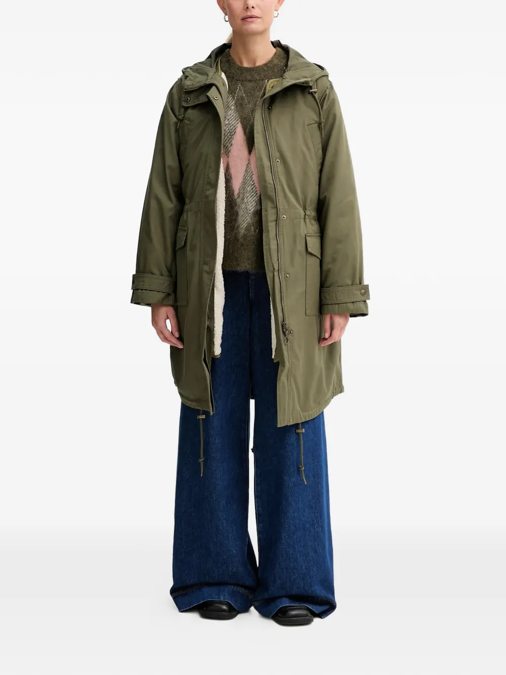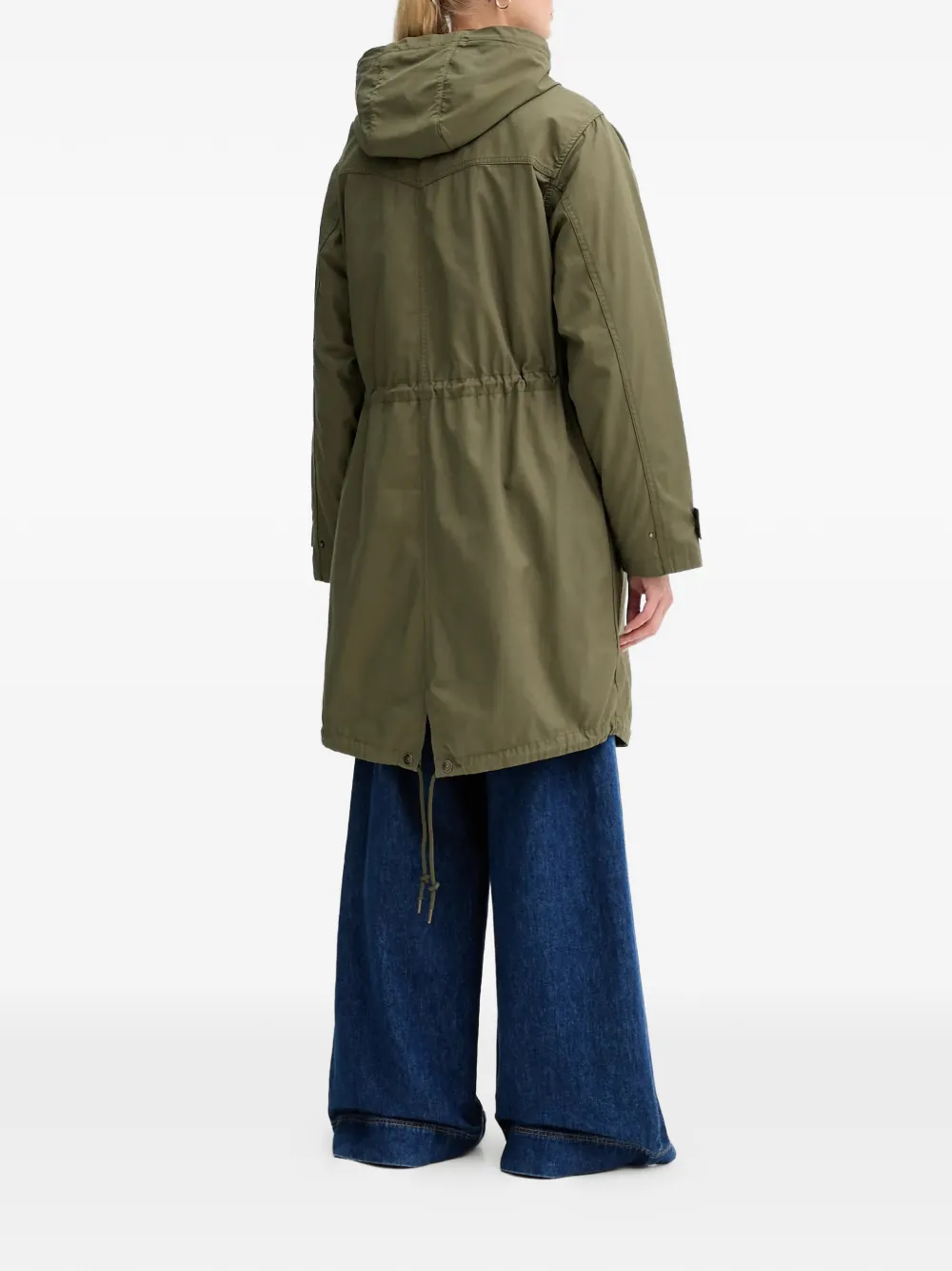 Оливково-зеленый цвет, регулируемый низ на завязках, застежка-молния, накладные карманы с клапанами, капюшон, манжеты на пуговицах