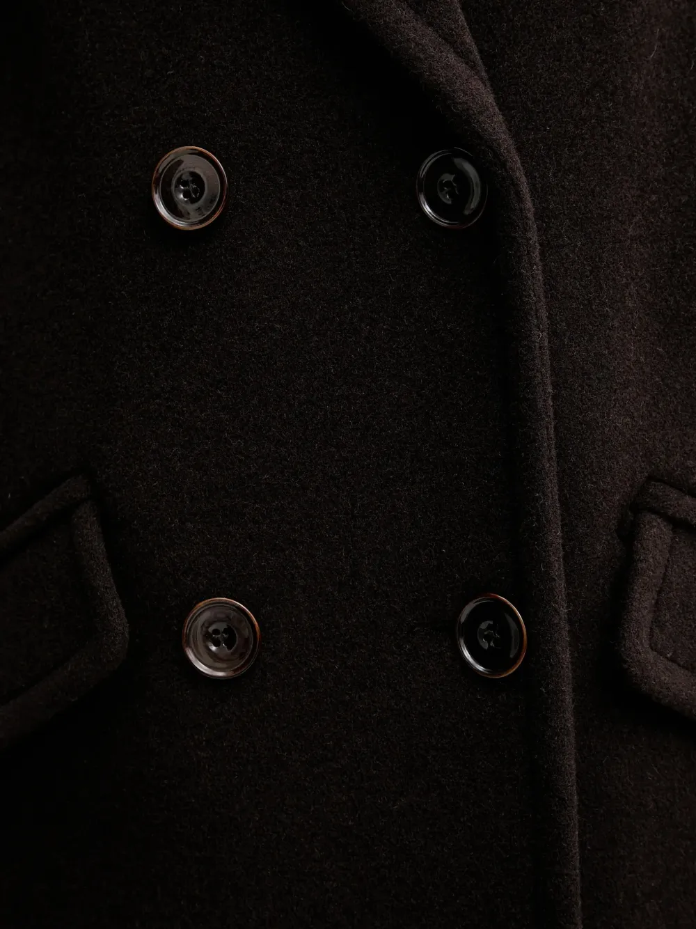 Коричневый двубортный пиджак с застежкой на пуговицы, лацканами с вырезом и манжетами с хлястиками