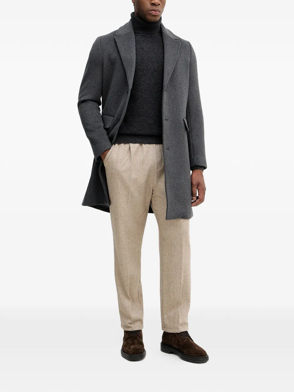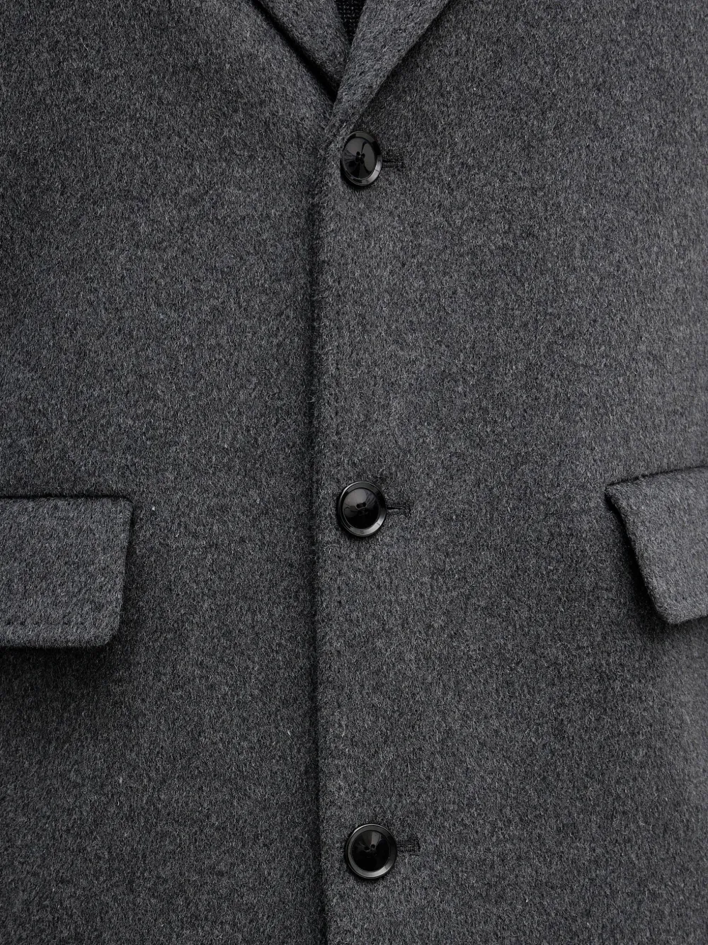 Серый цвет, застежка на пуговицы, лацканы с выемками, передние клапанные карманы, длинные рукава, центральная шлица сзади