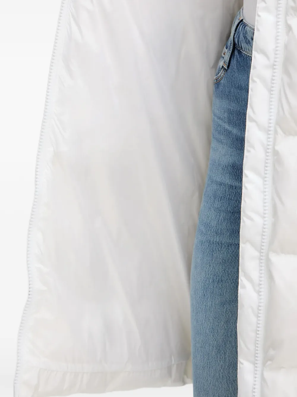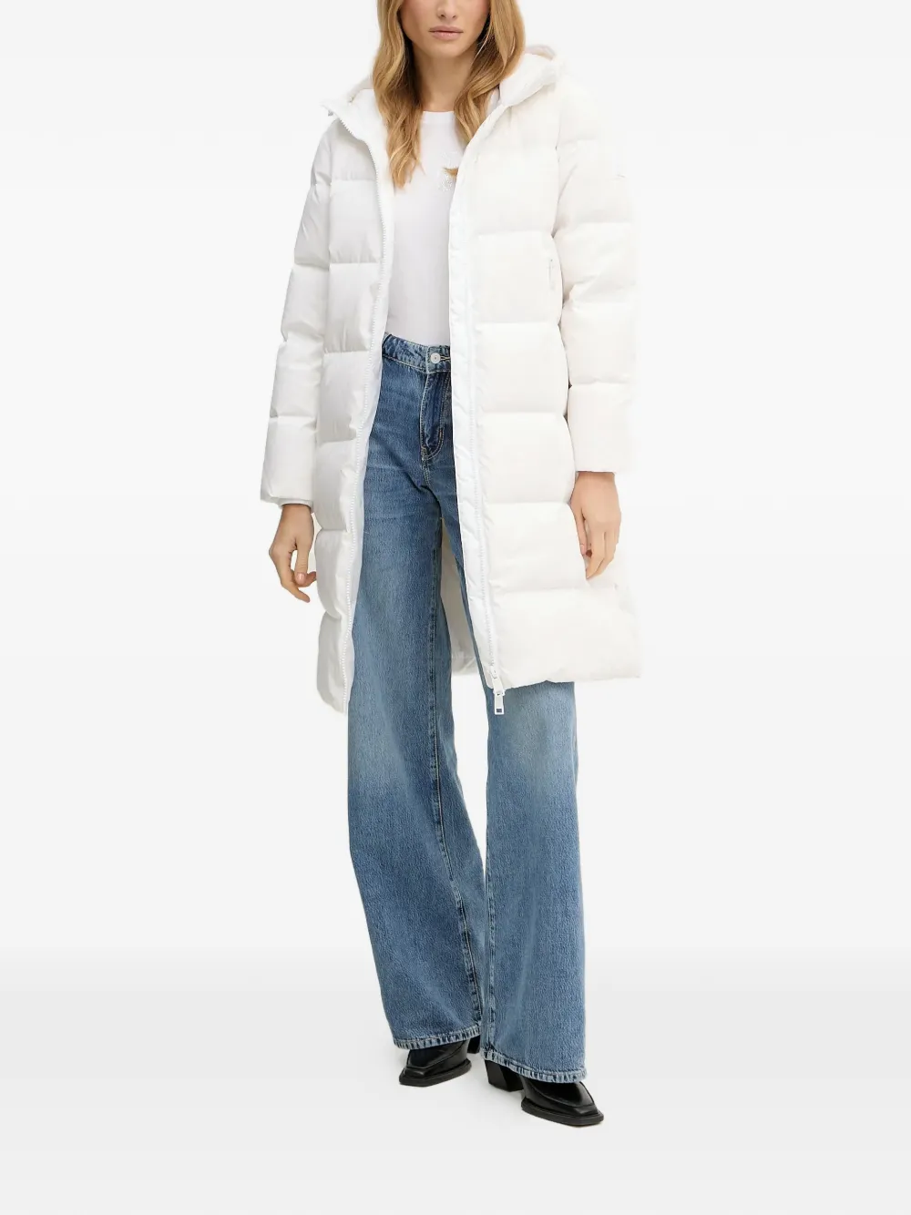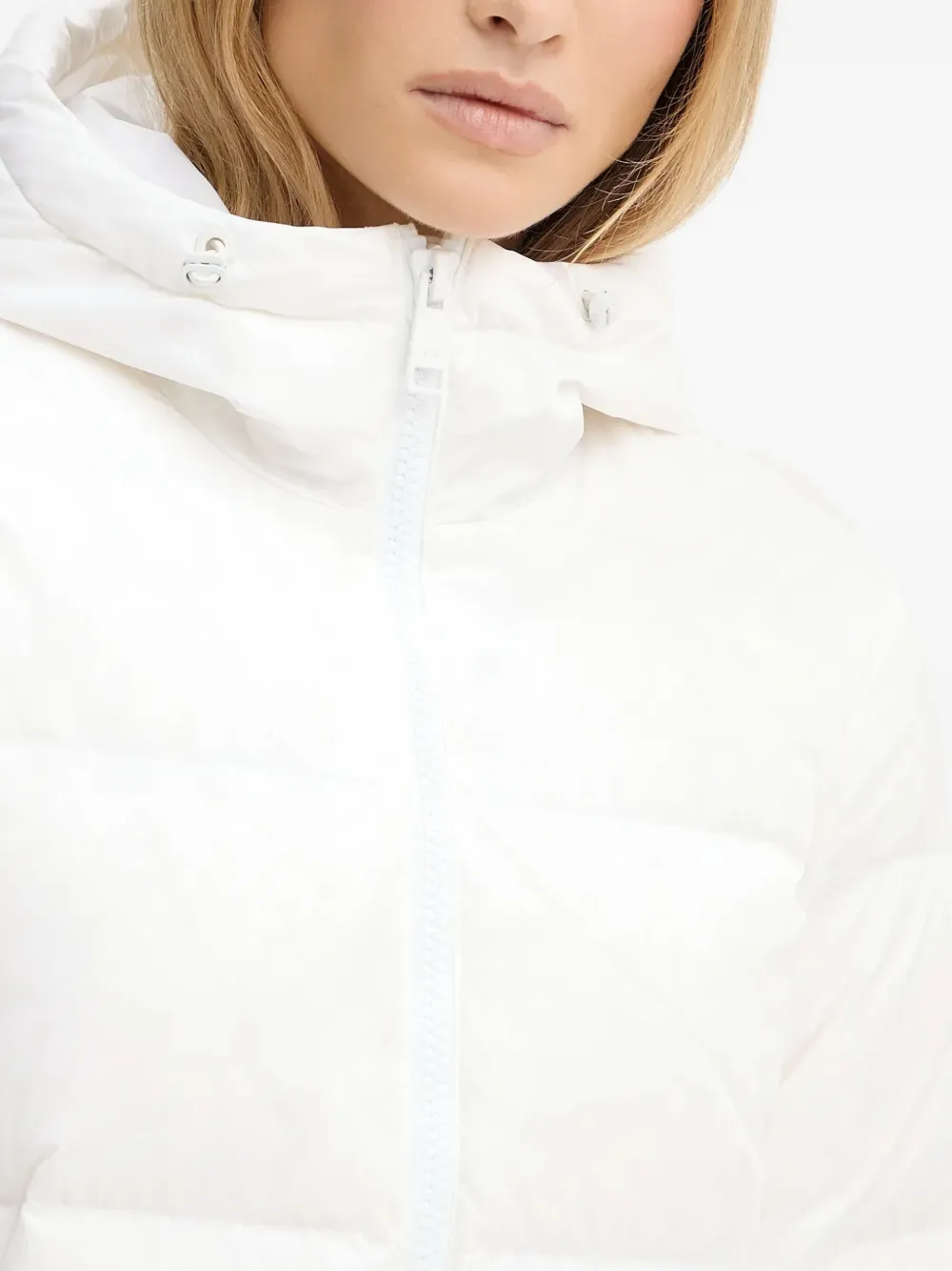 Белая стеганая куртка с капюшоном, застежкой-молнией, боковыми карманами и нашивкой с логотипом