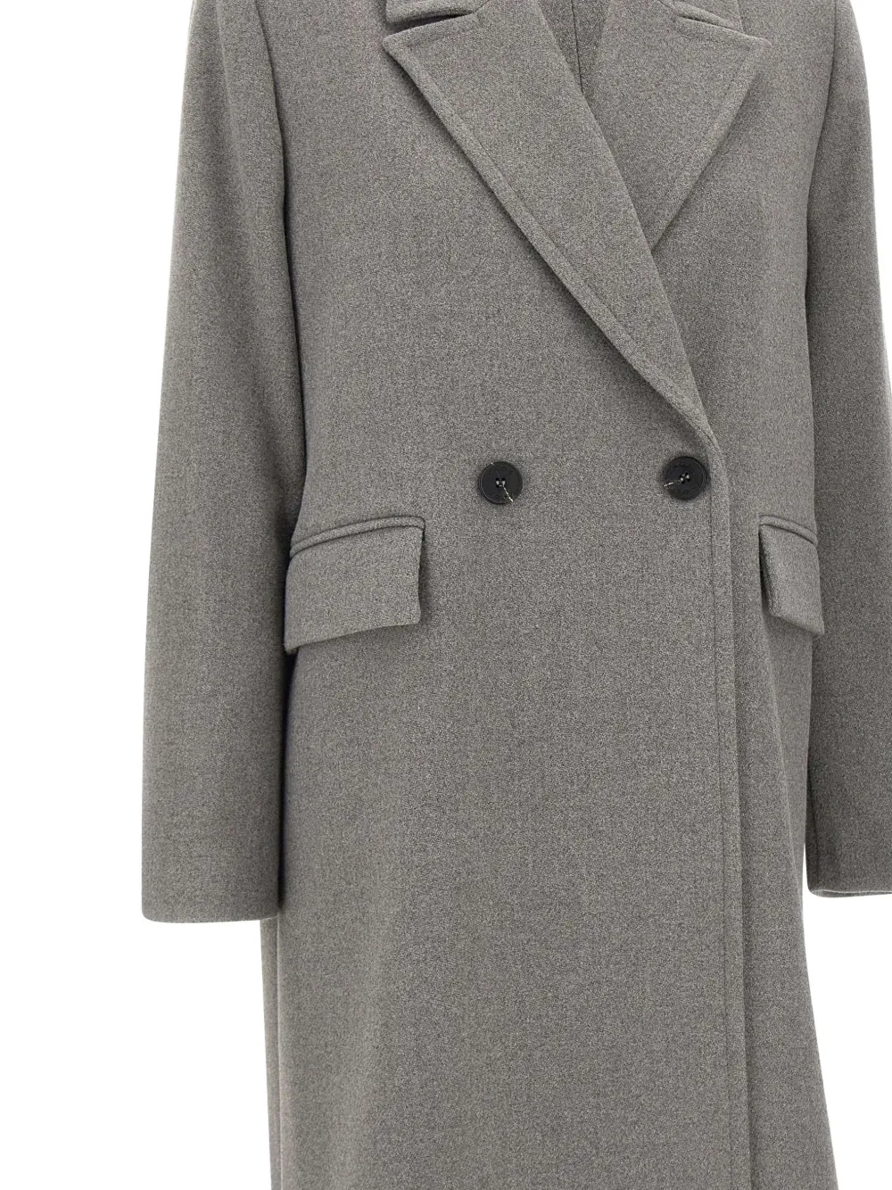 Серый пиджак с лацканами, клапанами на карманах, двубортной застежкой и прямым кроем