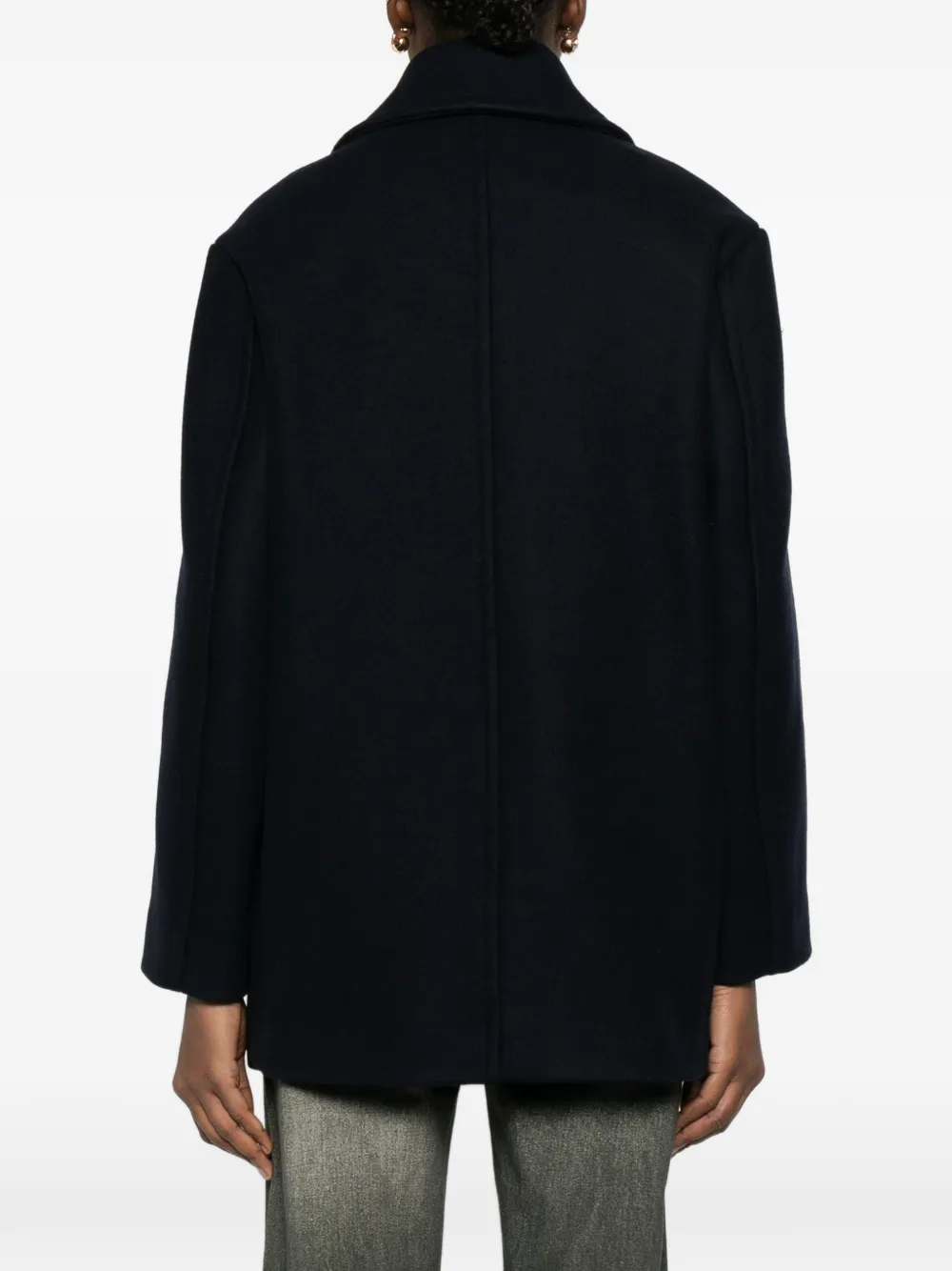Темно-синий цвет, лацканы с вырезом, двубортная застежка на пуговицы, два кармана, длинные рукава, прямой подол