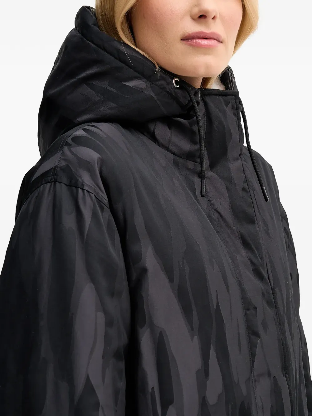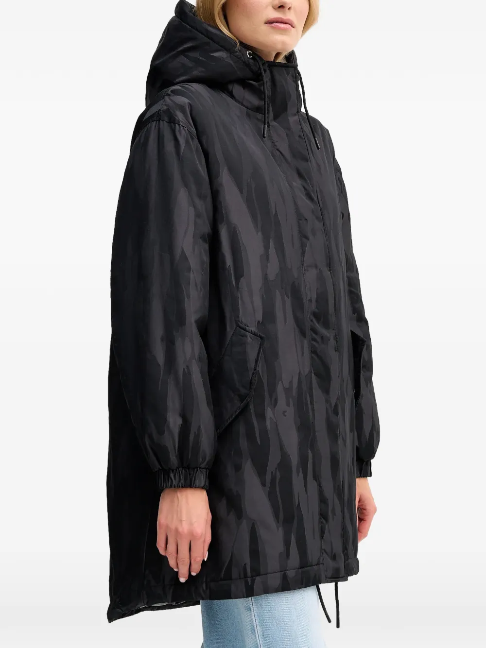 Черный камуфляжный узор, застежка-молния спереди, капюшон на кулиске, длинные рукава, прорезные карманы