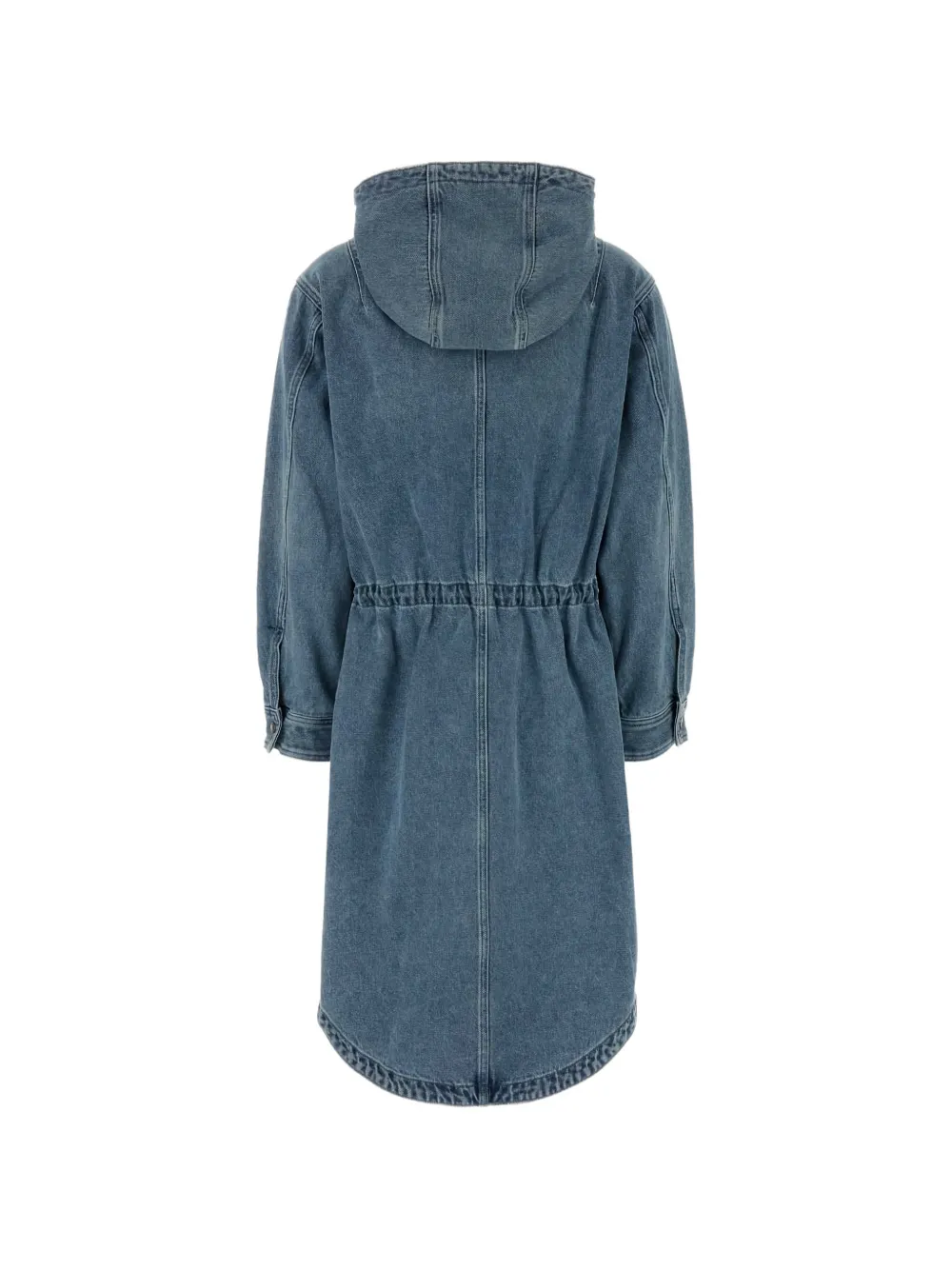 Синий хлопковый, застежка на кулиску, передние накладные карманы с клапанами, застежка на пуговицы, длинные рукава