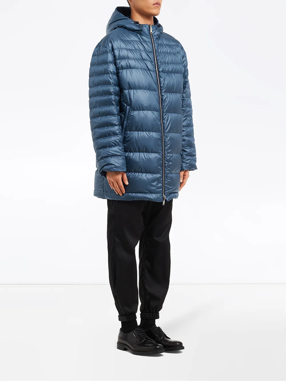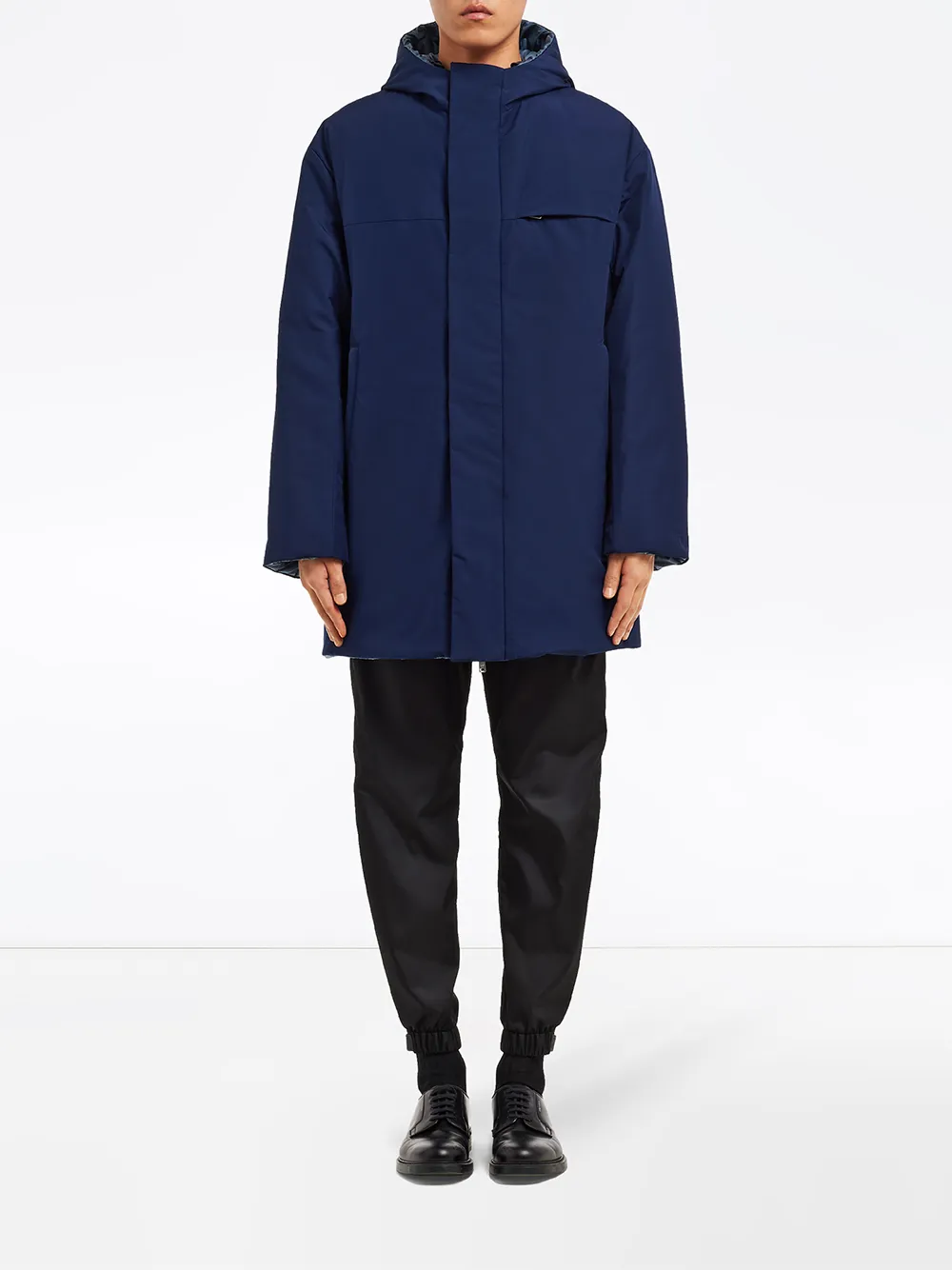 Сделка дня: две вещи по цене одной. Двусторонний пуховик от Prada (Прада) темно-синего и голубого цвета дополнен дутой подкладкой, которую можно вывернуть наружу. Модель имеет капюшон, застежку на молнии спереди, длинные рукава, нагрудный карман, два передних кармана и среднюю длину.