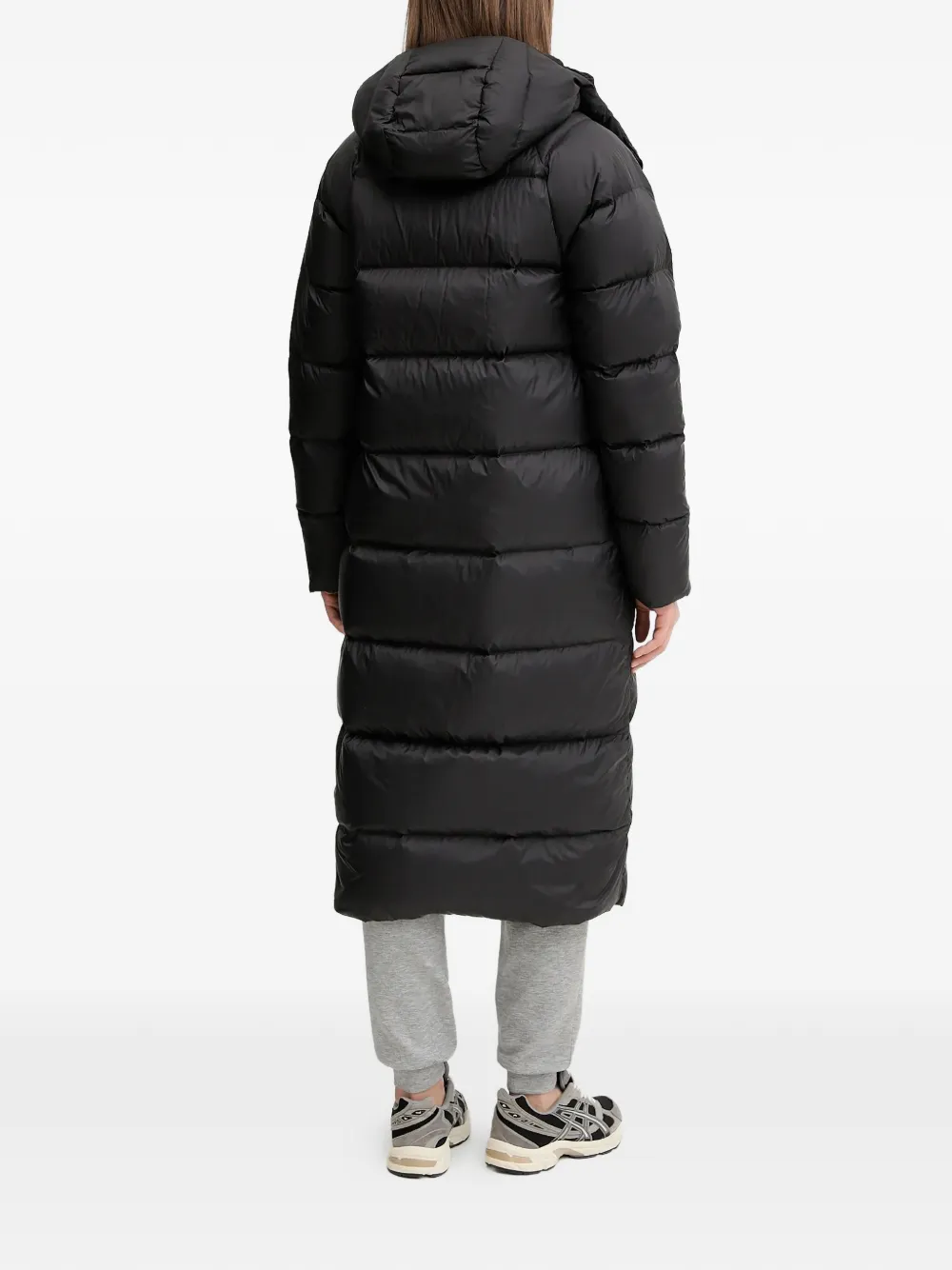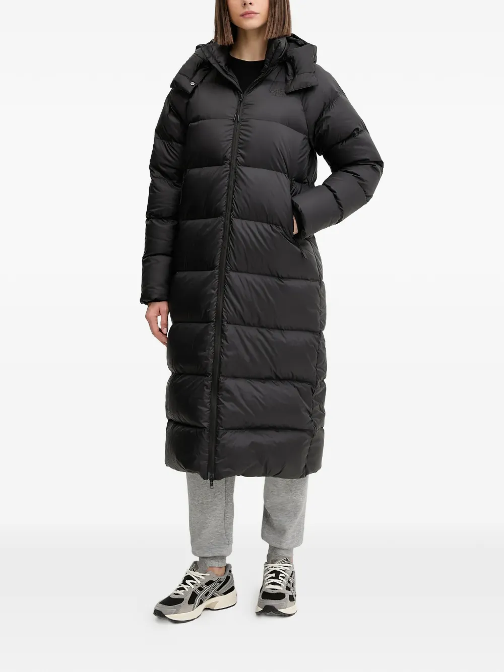 Черная пуховая куртка с капюшоном, застежкой-молнией, длинными рукавами и логотипом