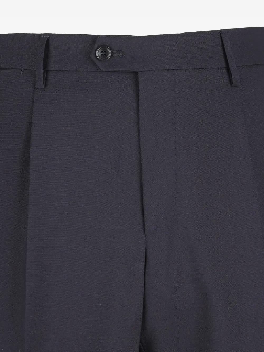 Темно-синий двубортный костюм из двух предметов с застежкой на пуговицы, лацканом и прорезными карманами с клапанами