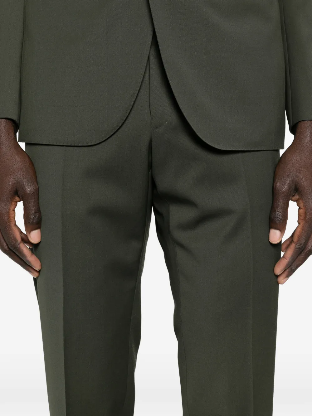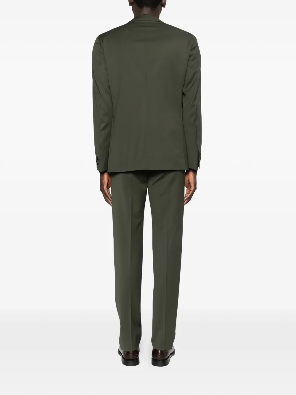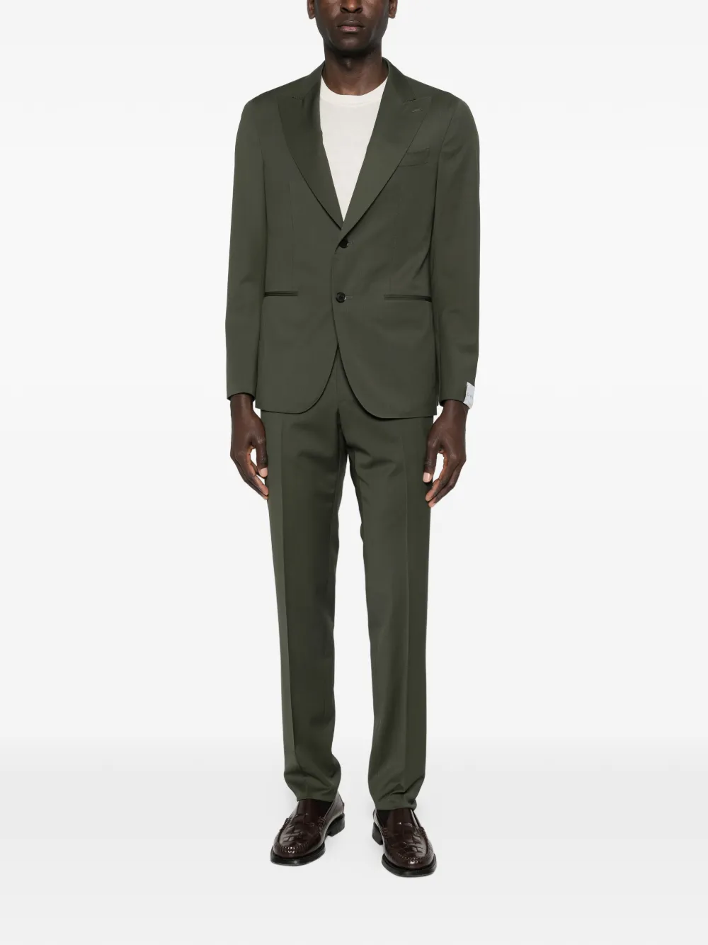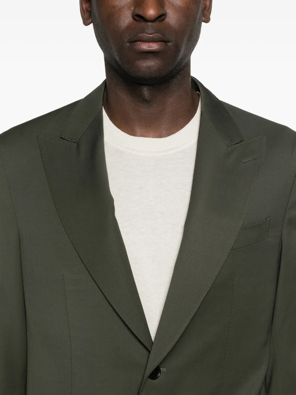 Оливково-зеленый цвет, лацканы с острыми концами, застежка на пуговицы, длинные рукава